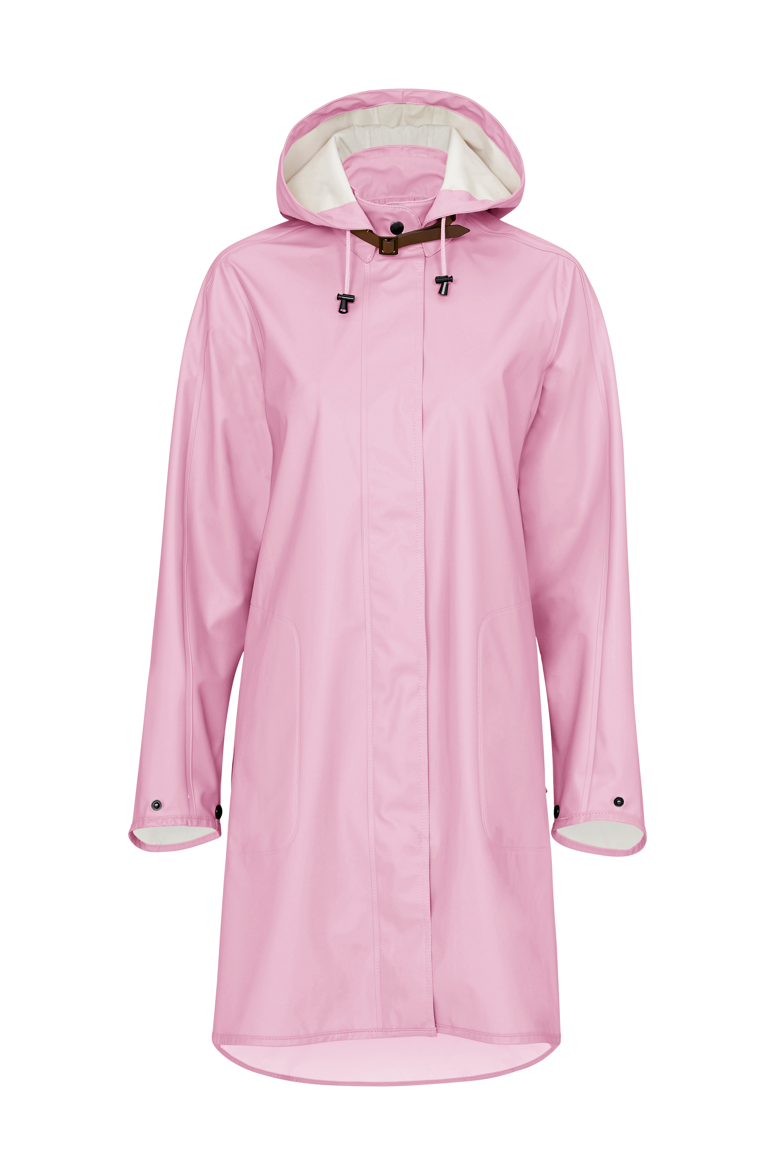 Regnfrakke Rain71 fra Ilse Jacobsen. Let A-formet model med stolpelukning som har skjult 2-vejslynlås (YKK) og trykknapper samt høj krave med knaptamp foran. Aftagelig hætte med løbegang og stop og to store, indsatte lommer i siderne. Justerbar ærmekant med trykknap og afrundet kant forneden med længere bagstykke og slids med trykknapper i siderne. Længde foran ca. 93 cm og bagpå ca. 103 cm i str. M.