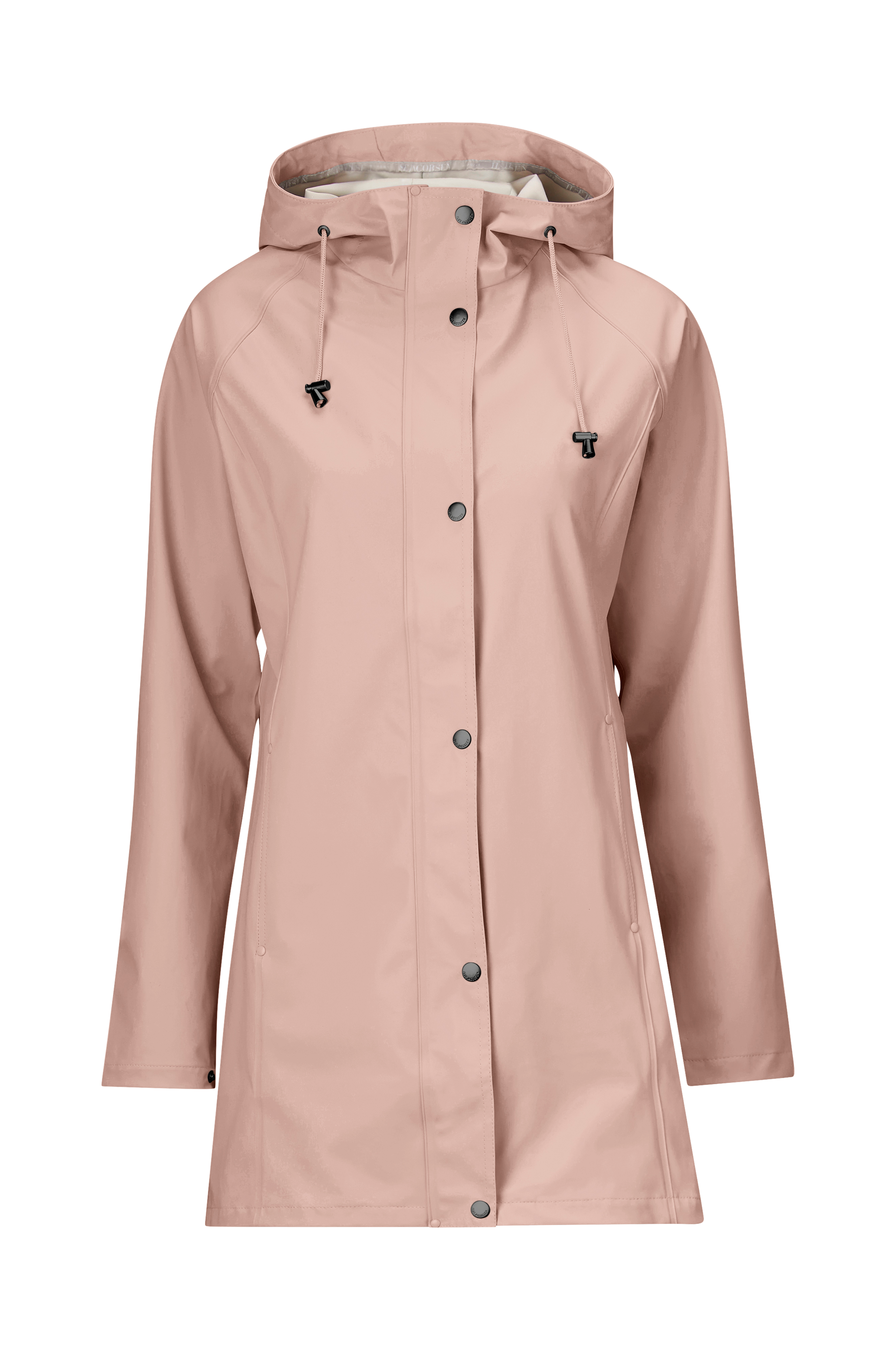 Regnfrakken er virkelig både stilfuld og praktisk! Velsyet med både delbar lynlås og knapper. Svejsede sømme og blødt bøjeligt materiale. God kapuschong, der beskytter ordentligt. D…