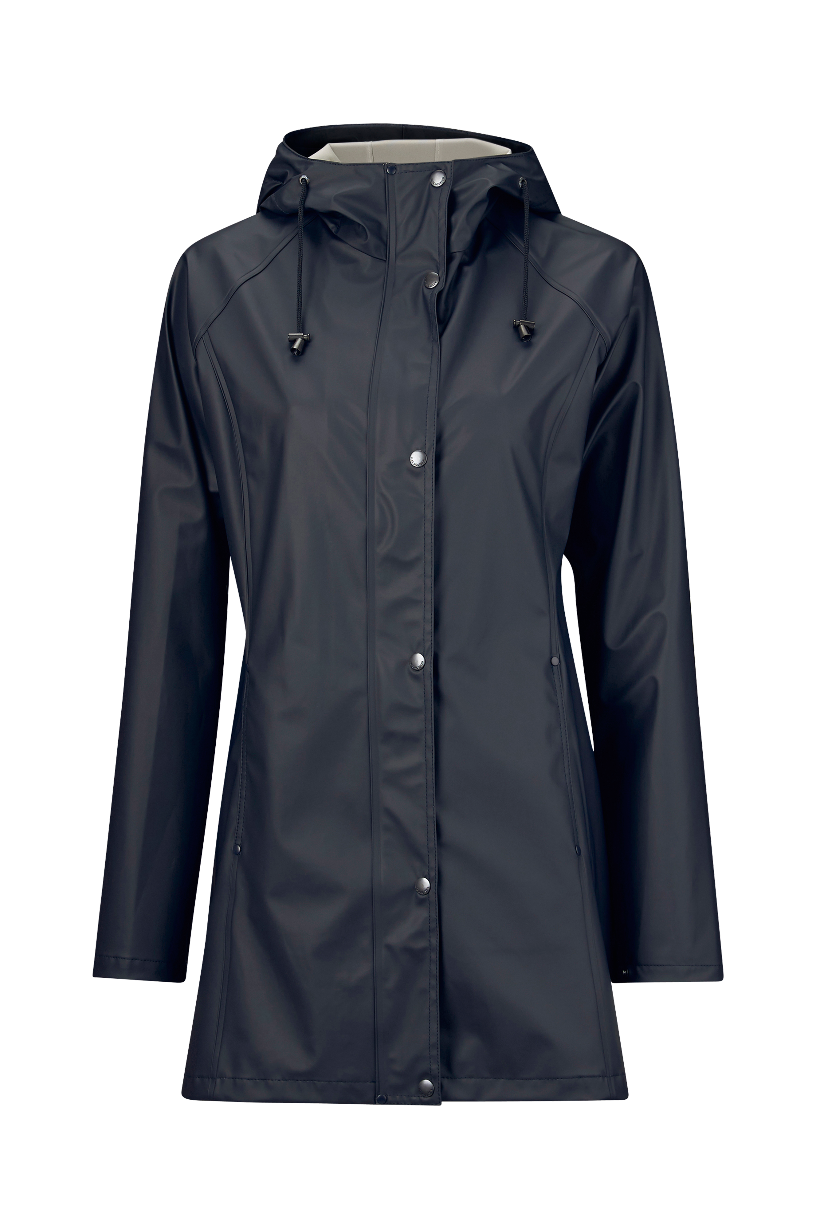 Regnfrakken er virkelig både stilfuld og praktisk! Velsyet med både delbar lynlås og knapper. Svejsede sømme og blødt bøjeligt materiale. God kapuschong, der beskytter ordentligt. D…