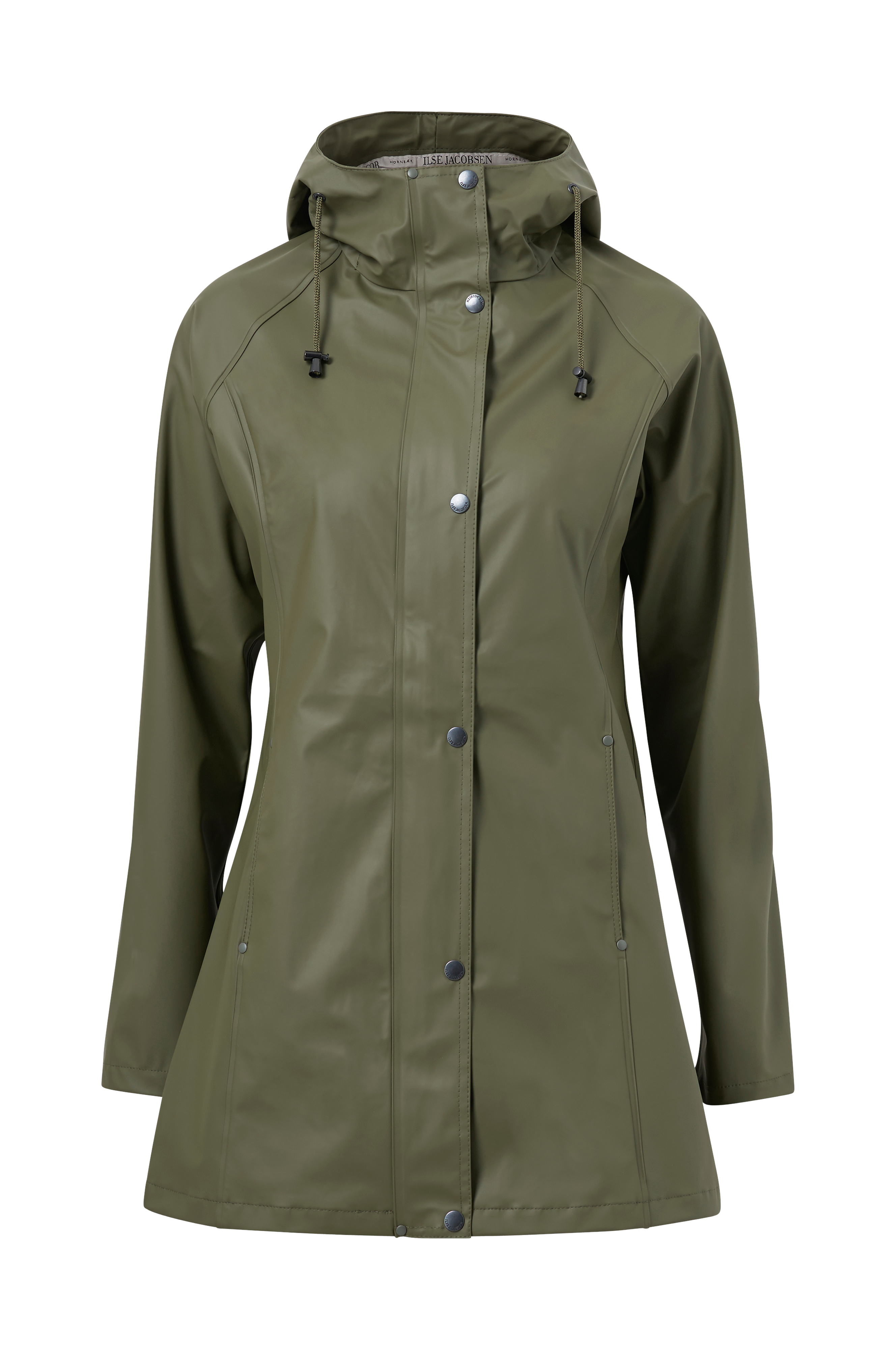 Regnfrakken er virkelig både stilfuld og praktisk! Velsyet med både delbar lynlås og knapper. Svejsede sømme og blødt bøjeligt materiale. God kapuschong, der beskytter ordentligt. D…