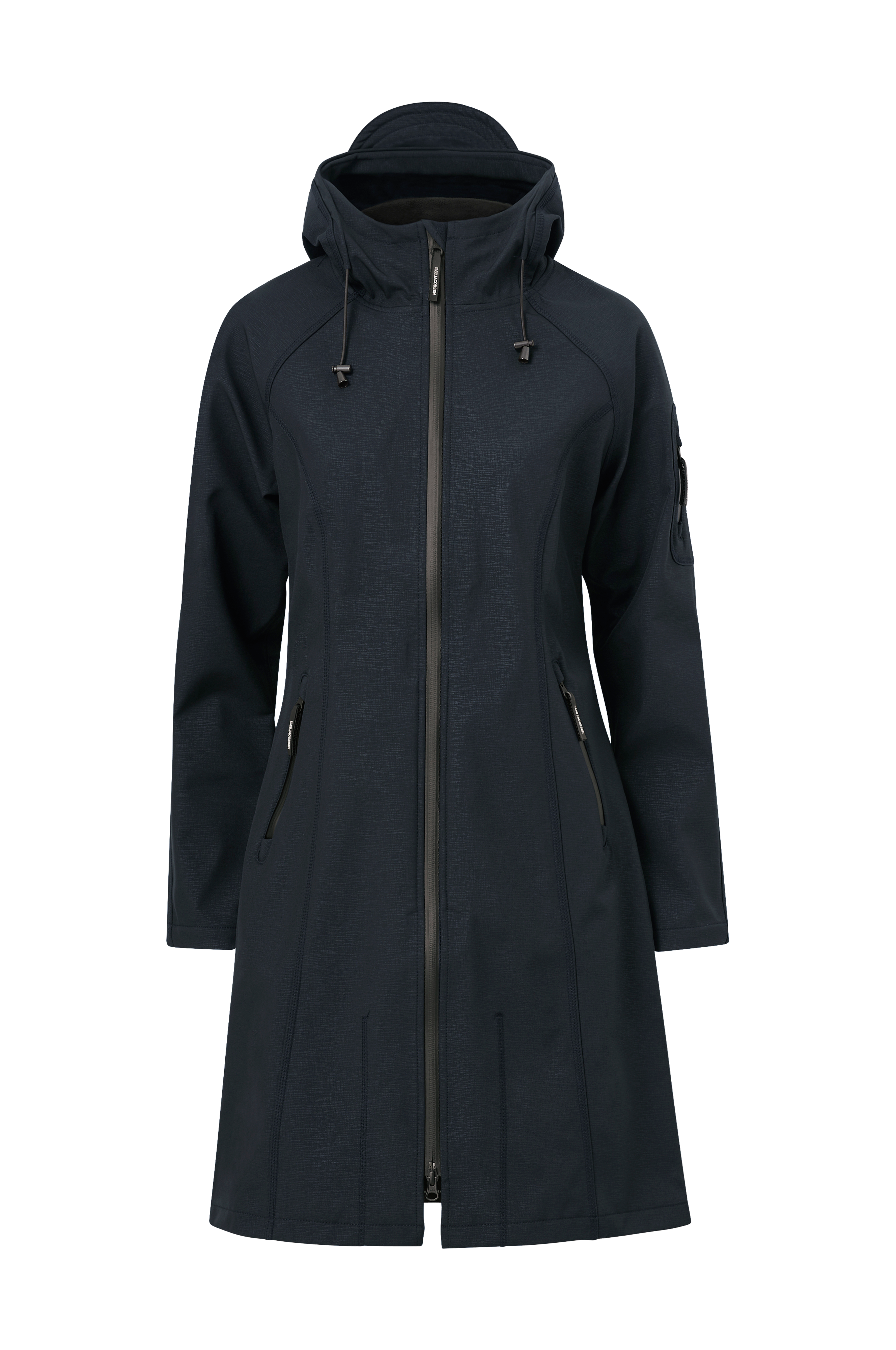 Softshell-regnfrakke i åndbar kvalitet og med tapede sømme. Vandsøjletryk 5000 mm. Figursyet model med vandtæt tovejslynlås og høj krave. Hætte med skygge og elastisk snøre i løbegang med stop. To indsatte lommer med vandtætte lynlåse og en lille lomme med lynlås på det ene ærme. Slids med trykknap forneden bagpå. Blød inderside i fleece. Længde ca. 98 cm i str. 36.