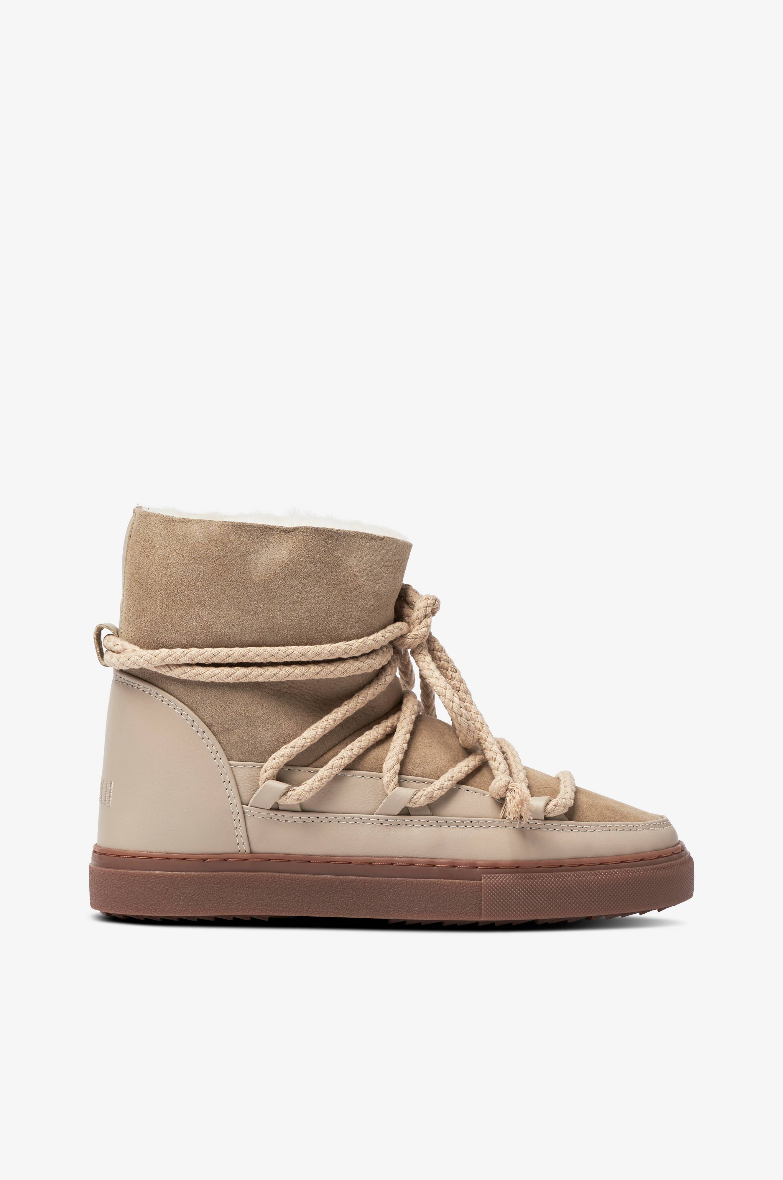 Boots i blød ruskind med varmt for af ægte fårepels. Kant i skind rundt om samt bagpå og snøre i store skindstropper. Broderi bagpå og høj sålekant rundt om.Skafthøjde ca. 14 cm.