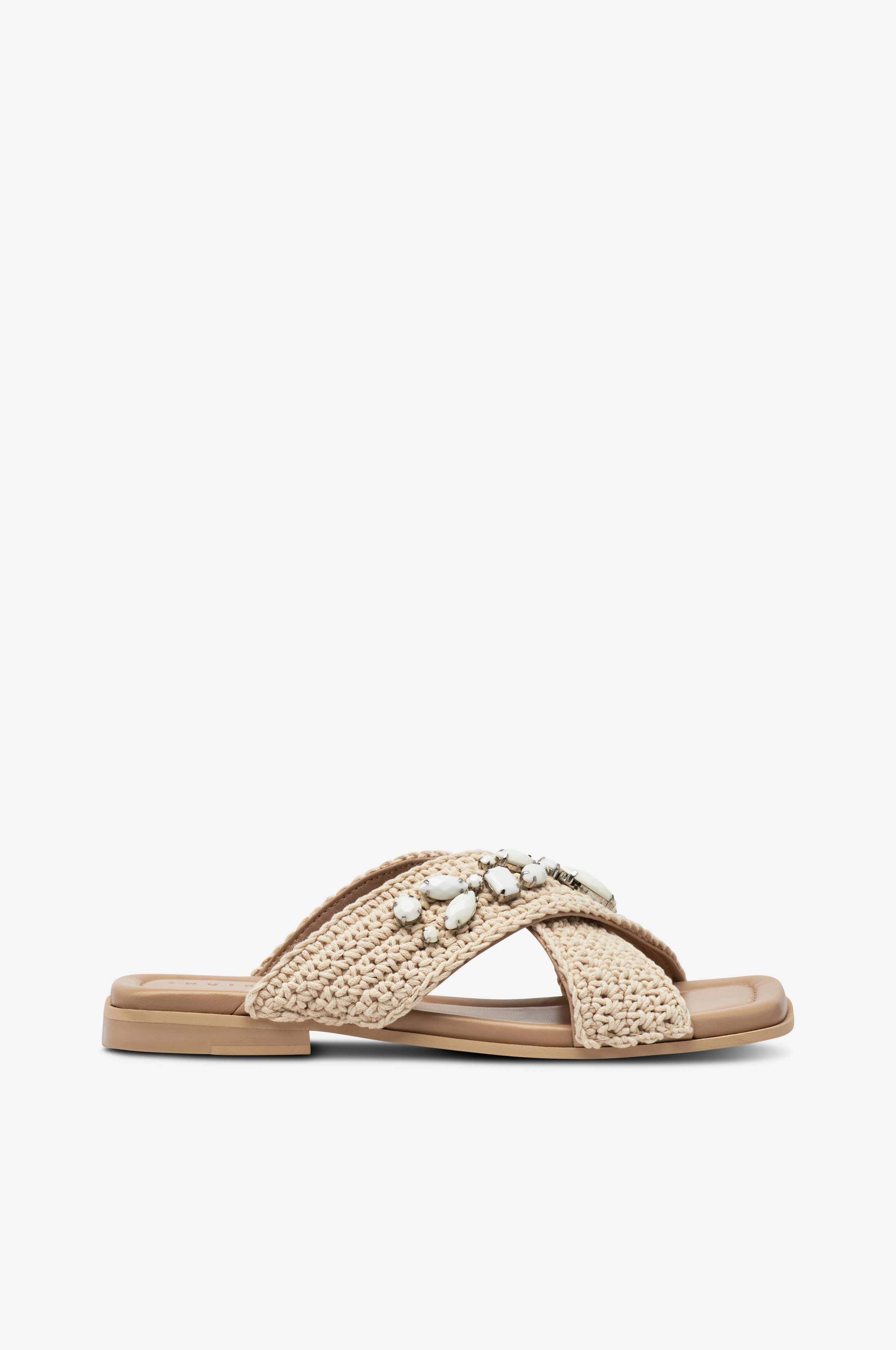 • Sandaler med firkantet tåform• Strikkede, krydsende remme med dekorative sten• For i læder• Blød polstret, læderbetrukket fodseng• Ydersål i gummi