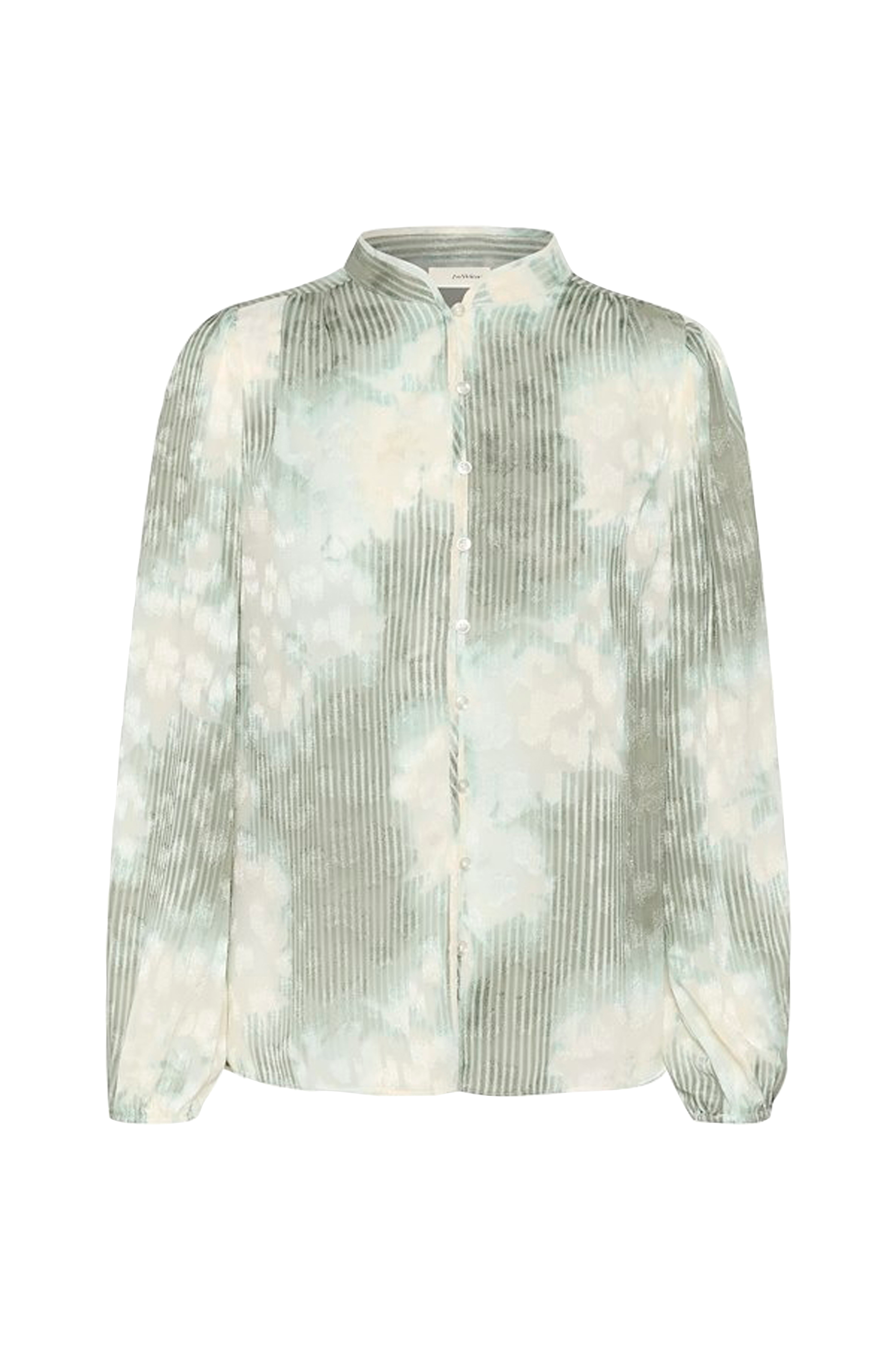 • Lige, jacquardmønstret model i chiffon• Rund hals med lille kant• Løkkelukning hele vejen frem• Langt ballonærme med elastik ved manchetterne• Samling på skuldrene