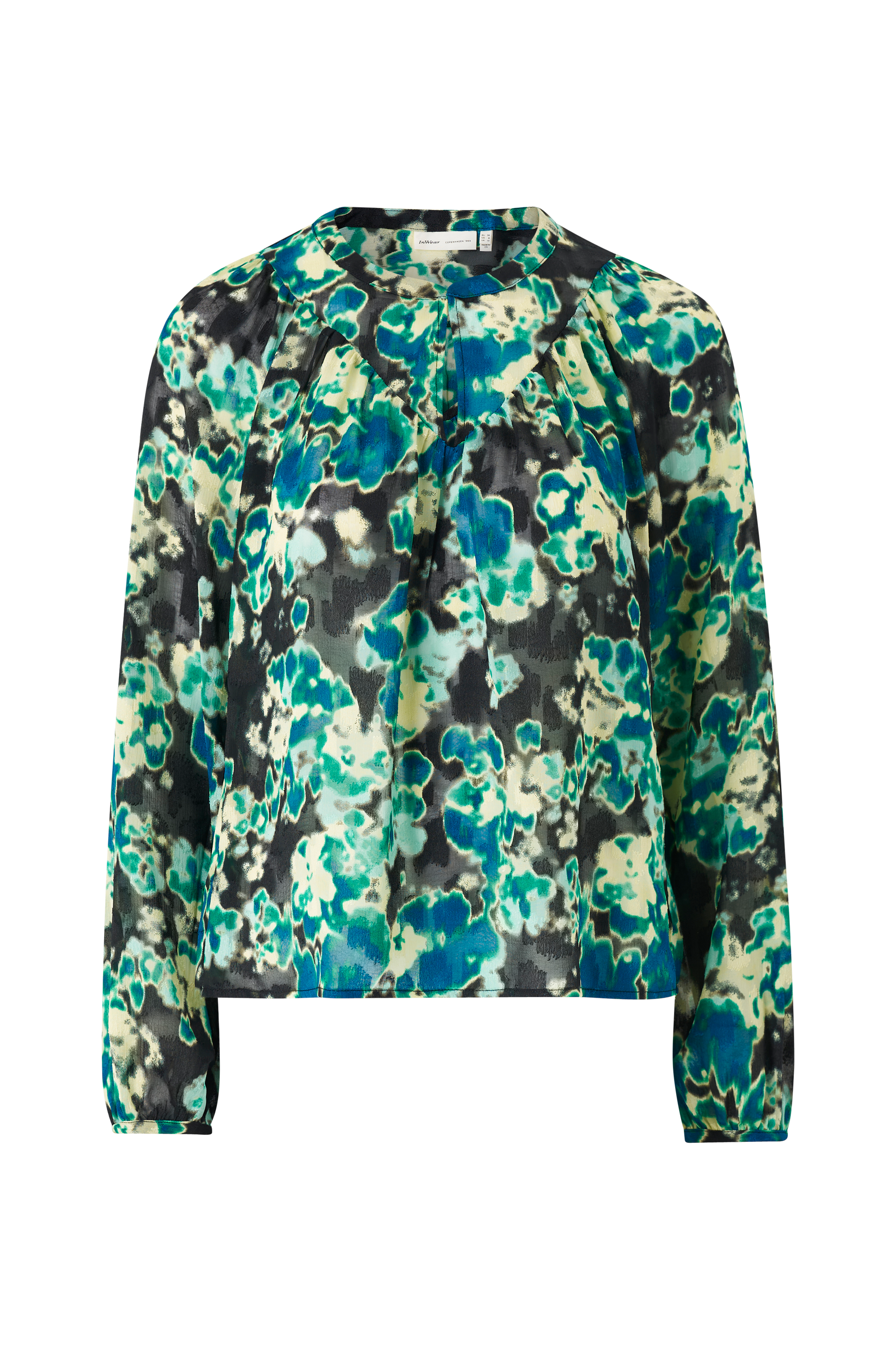 • Semitransparent materiale med skinnende mønster• Lange ærmer med knap ved manchetterne• Rund halsudskæring med ventilation og knap foran