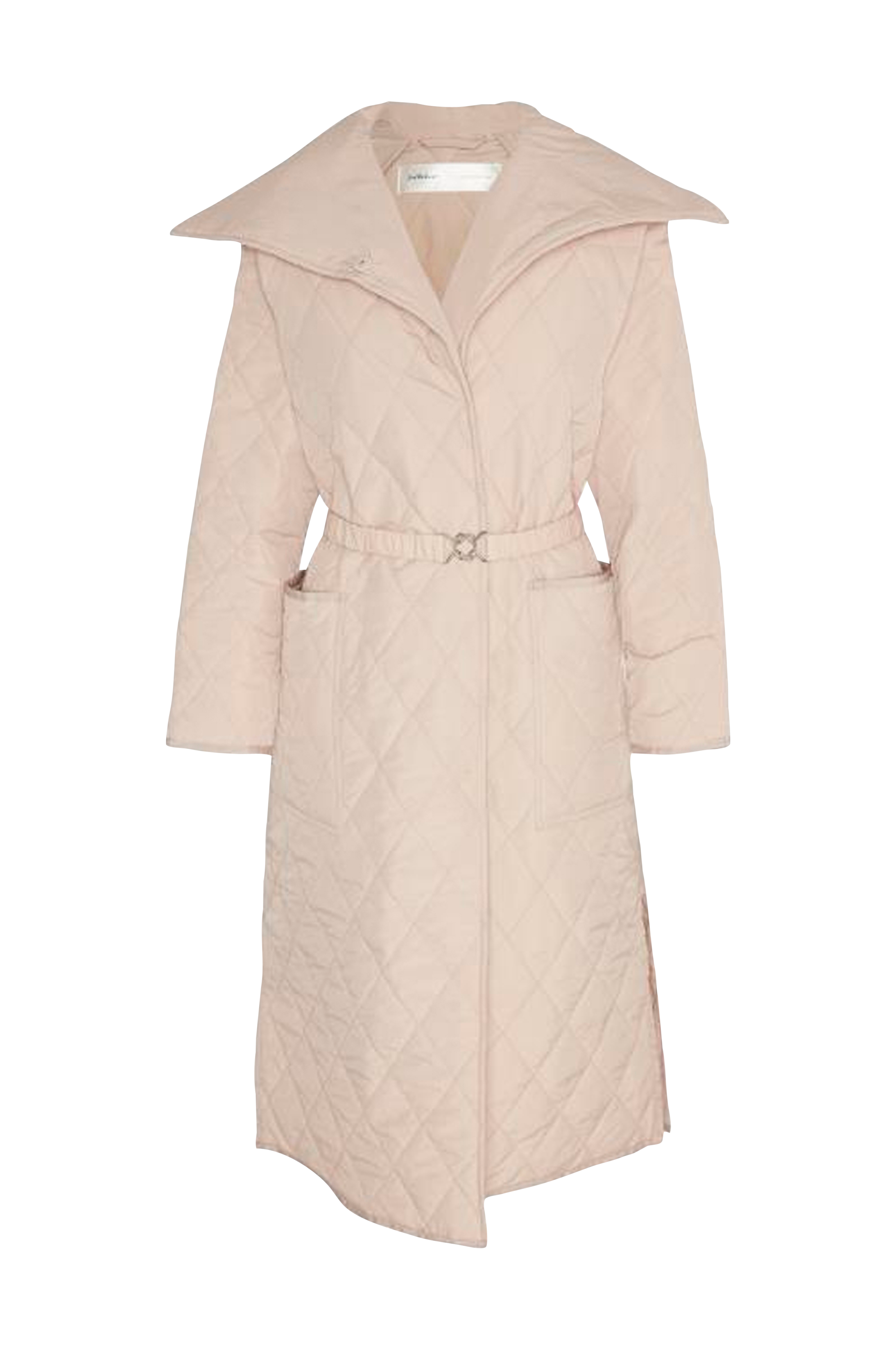 Quiltet og let vatteret frakke. Vandafvisende yderstof med let struktur. Stor krave og skjulte trykknapper. To lommer og slidser i siderne. Længde ca. 119 cm i str. 36.