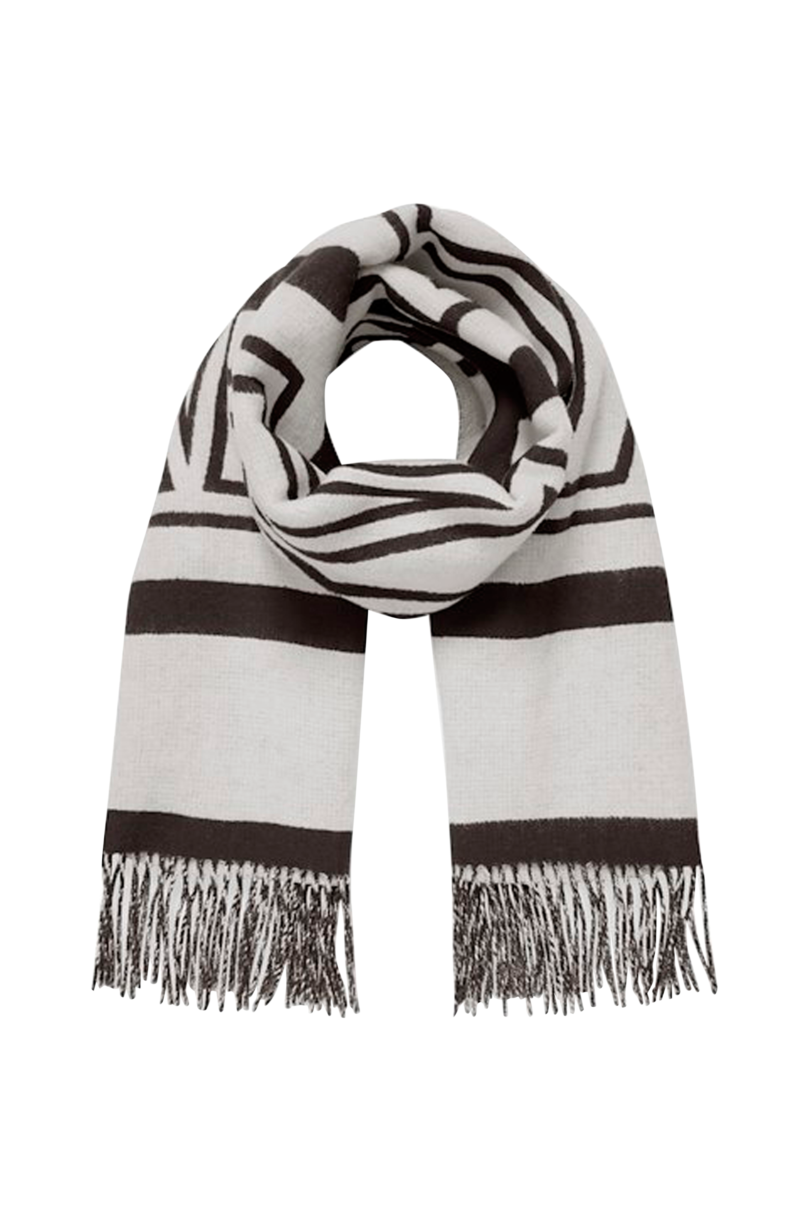 Vævet, mønstret tørklæde med frynser i enderne.Mål ca. 51 x 182 cm.