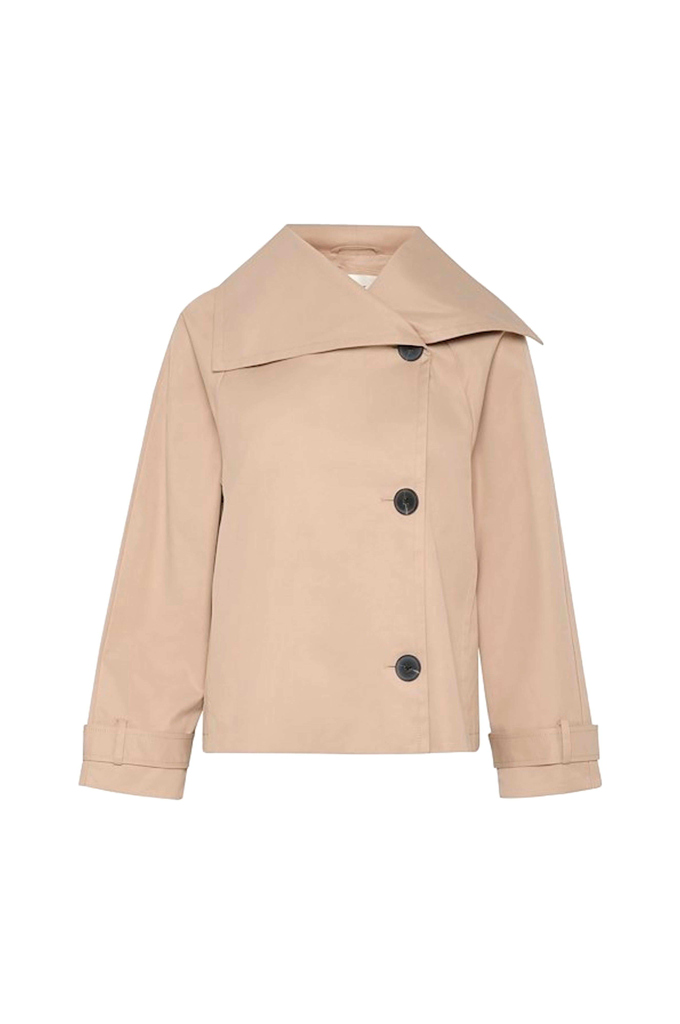 • Stor, bred krave• Asymmetrisk knapstolpe• Justérbare ærmeafslutninger med to knapper• To lommer• En inderlomme• Bølgeformet detalje på ryggen• Længde: 67 cm i størrelse 36