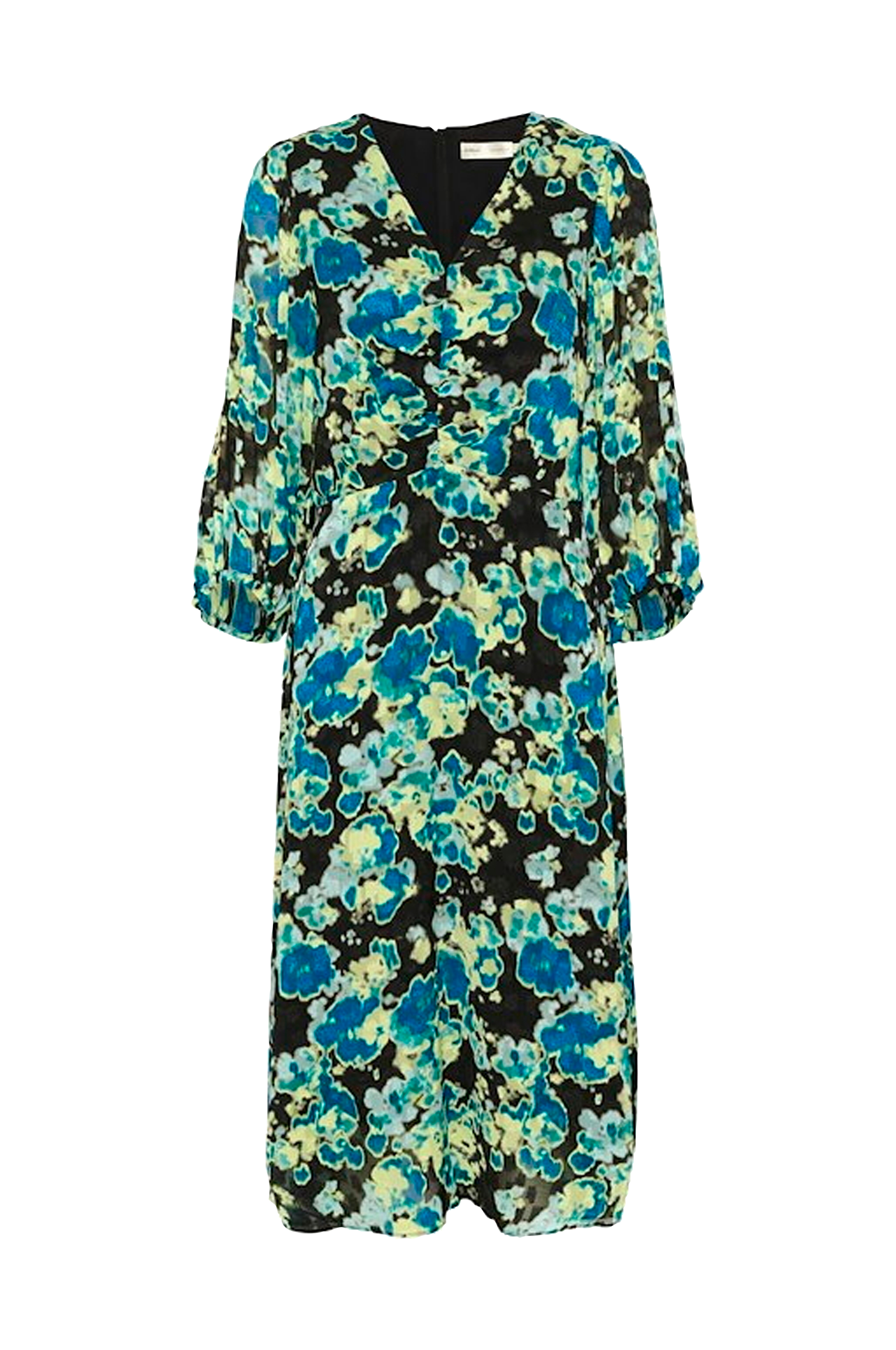 • V-formet halsudskæring• Skjult lynlås bagpå• Foret model• Uforede, brede ærmer med 3/4 længde• Elastisk bånd ved manchetterne• Længde: 127 cm i størrelse 36