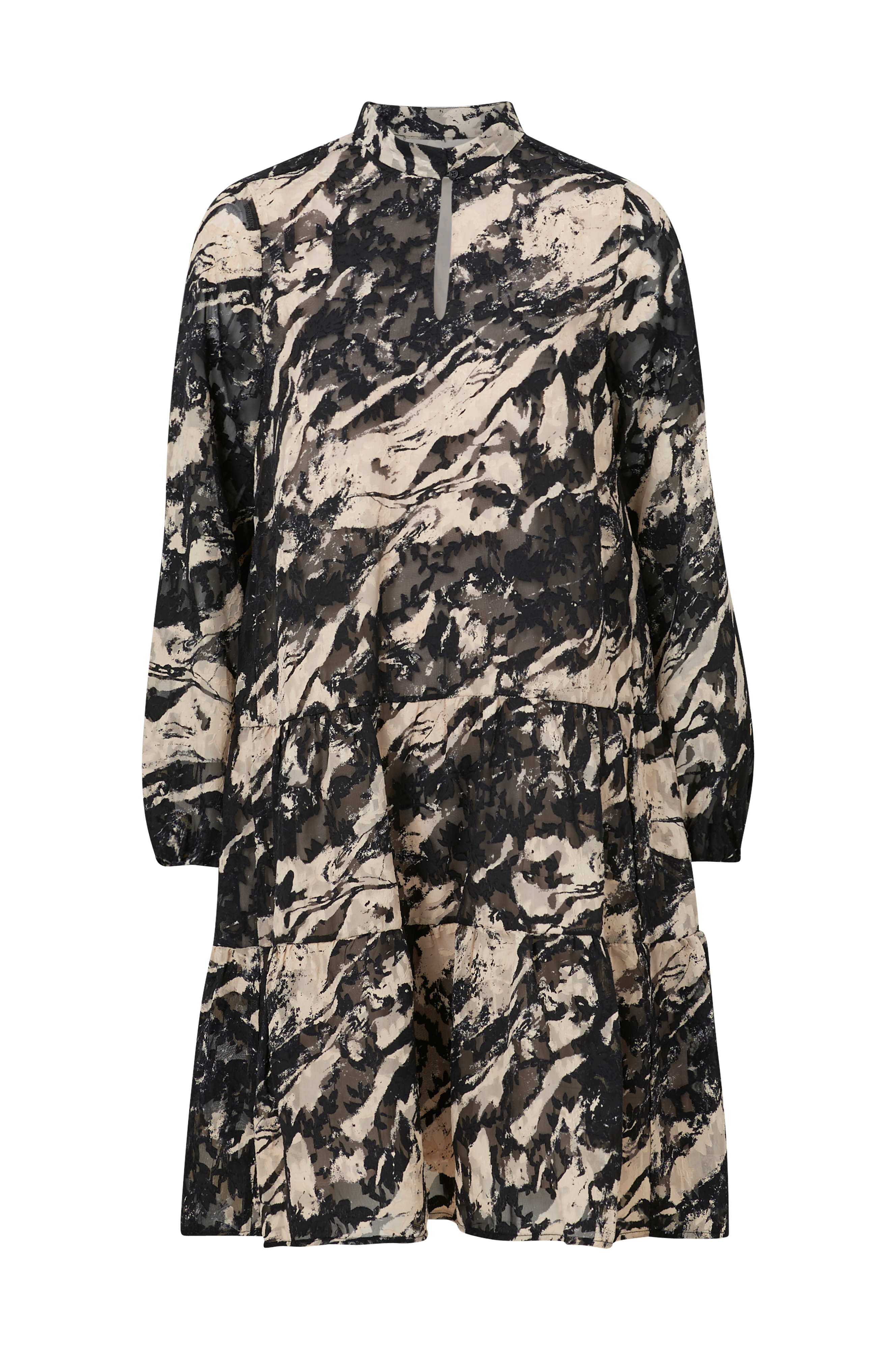 Kjole GillaIW Dress fra InWear. A-formet oversizemodel i organza med vævet jacquardmønster. Rund hals med påsyet kant og slids med knap foran. Langt ærme med indsat elastik i ærmekant samt afskæring på hoften med påsyet flæse forneden. Længde ca. 100 cm i str. 36.