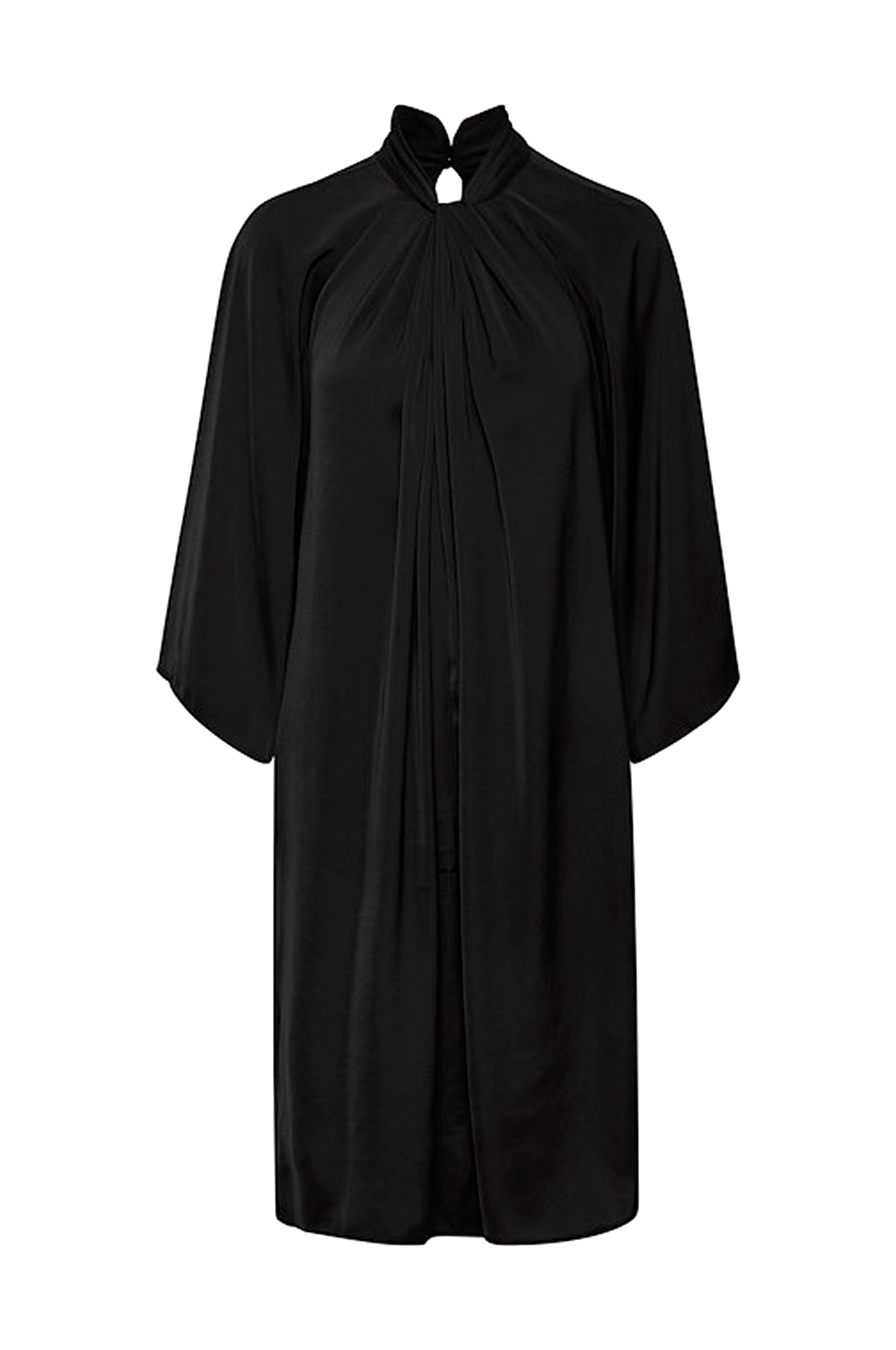 • Stilren kjole• Knudedetalje på udskæringen• Ventilation med knapper i nakken• Lange, brede ærmer• Kvalitet med glans• Længde: 98 cm i størrelse 38
