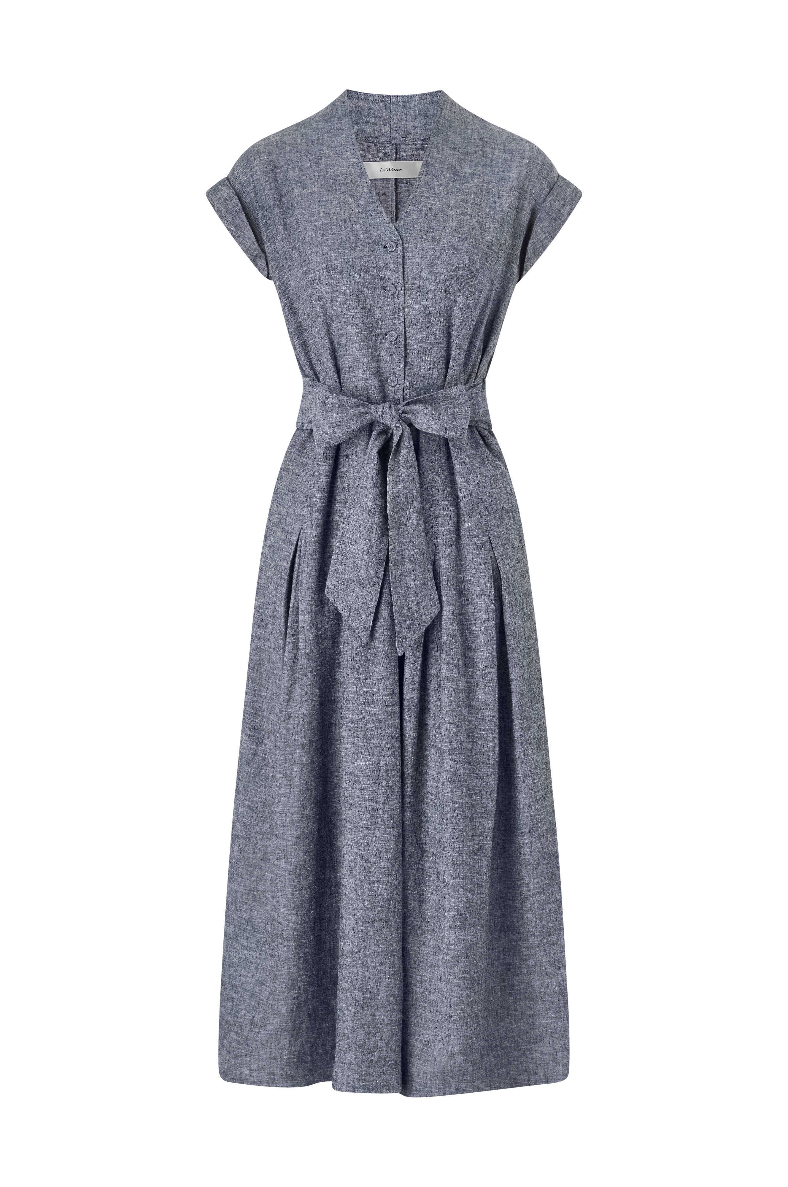 • Lang, behandlet kjole i hørblanding • V-formet halsudskæring • Korte, foldede ærmer • Knapstolpe foran • Bindebånd ved taljen • Skjult lynlåslukning i den ene side • Indlagte sidelommer • Modfold omkring den nederste kant • Længde: 132 cm i størrelse 36