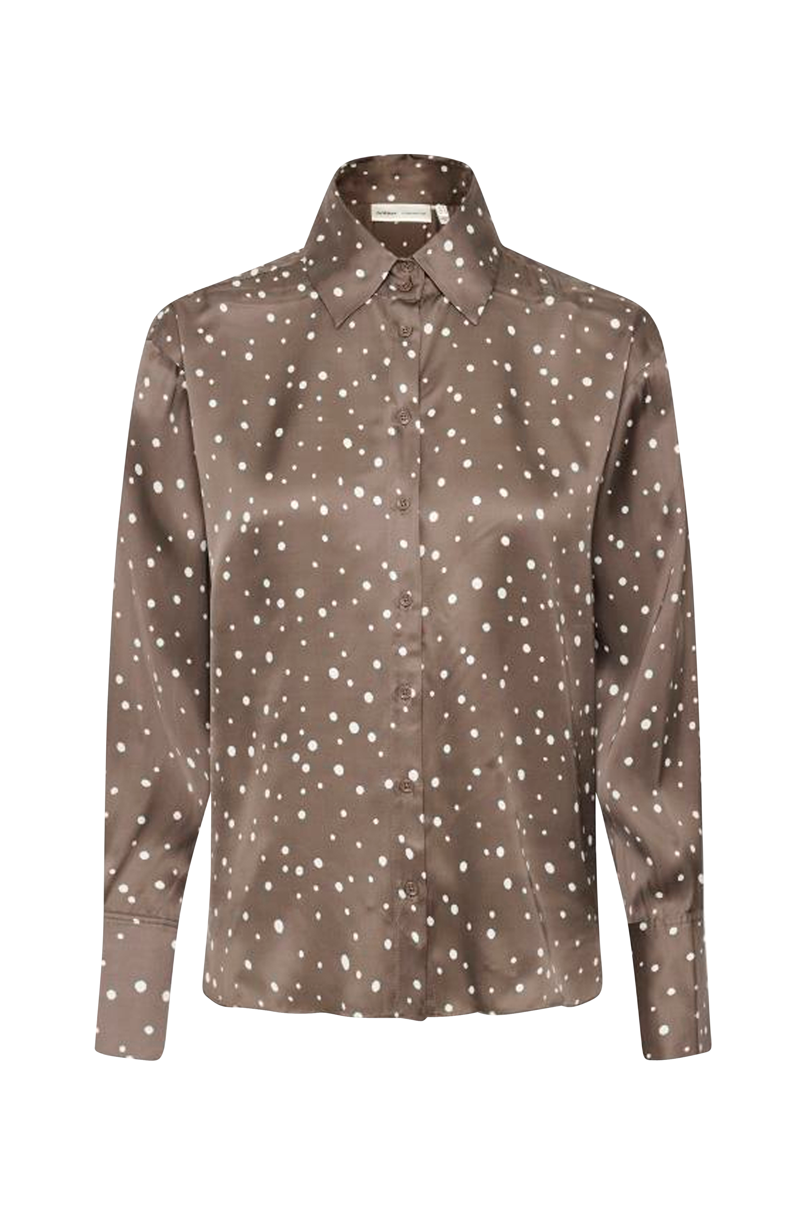 Skjorte i lige model med løst snit. Af vævet satin. Lidt større krave og lukning foran samt lagt modgående læg i ryggen. Bred manchet i ærmekant og rundskåret slids med små indsatse forneden i siderne.