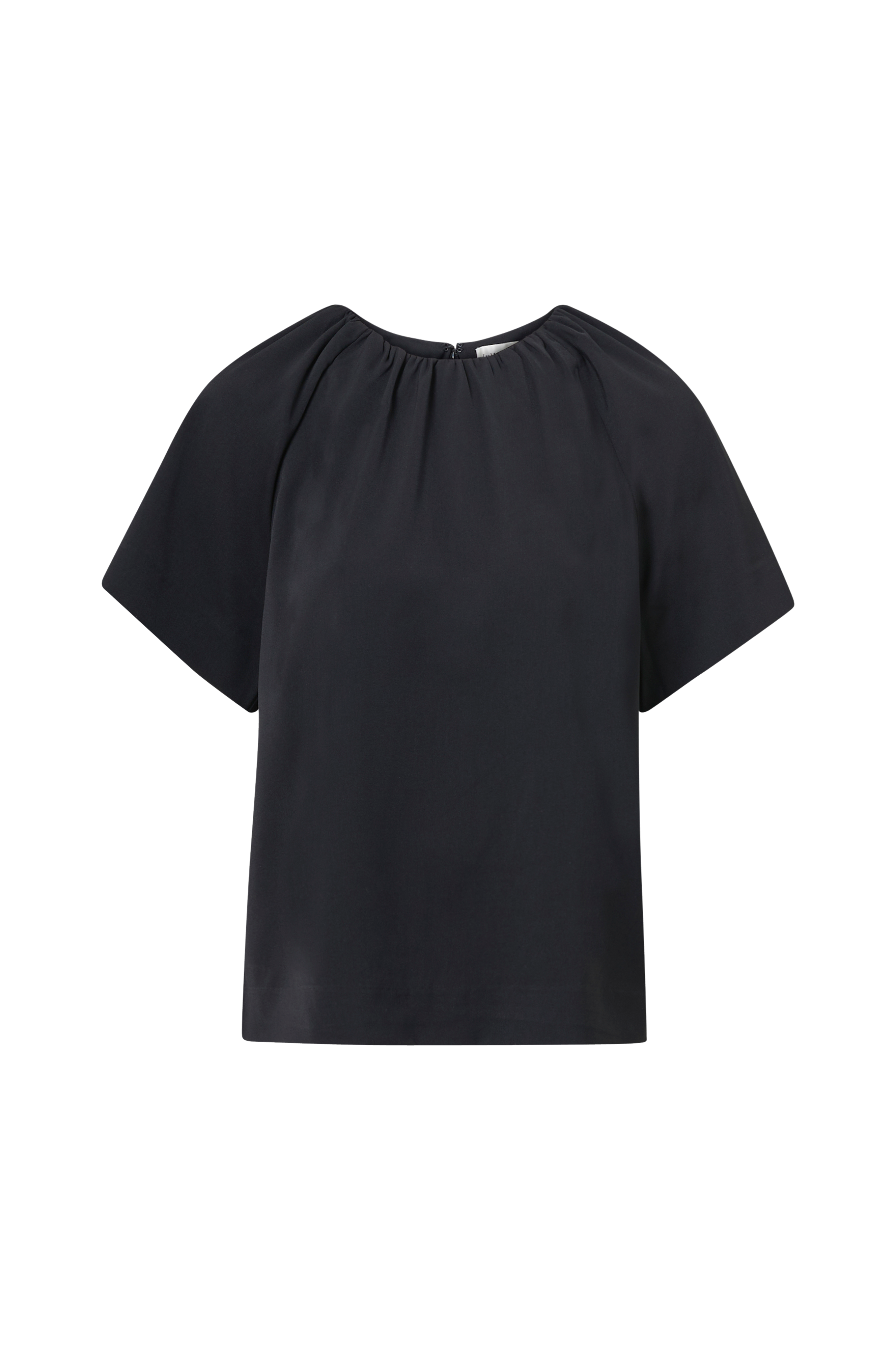 Lige model i vævet stretchkvalitet med løst snit. Rund hals med rynkning og skjult lynlås i ryggen samt kort raglanærme.