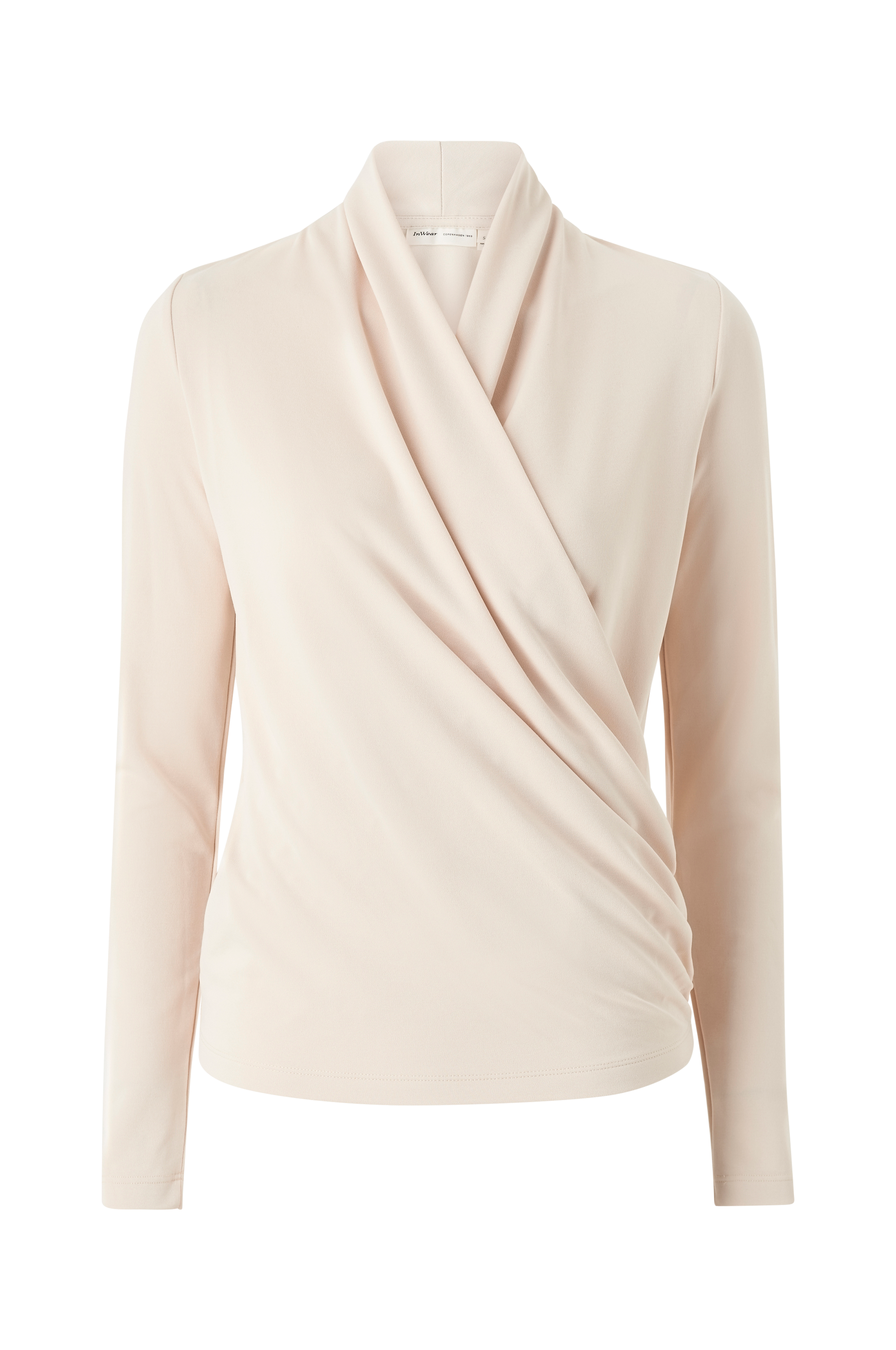 Langærmet slå om-top i blød stretchjersey. Rynkning forneden i den ene side.