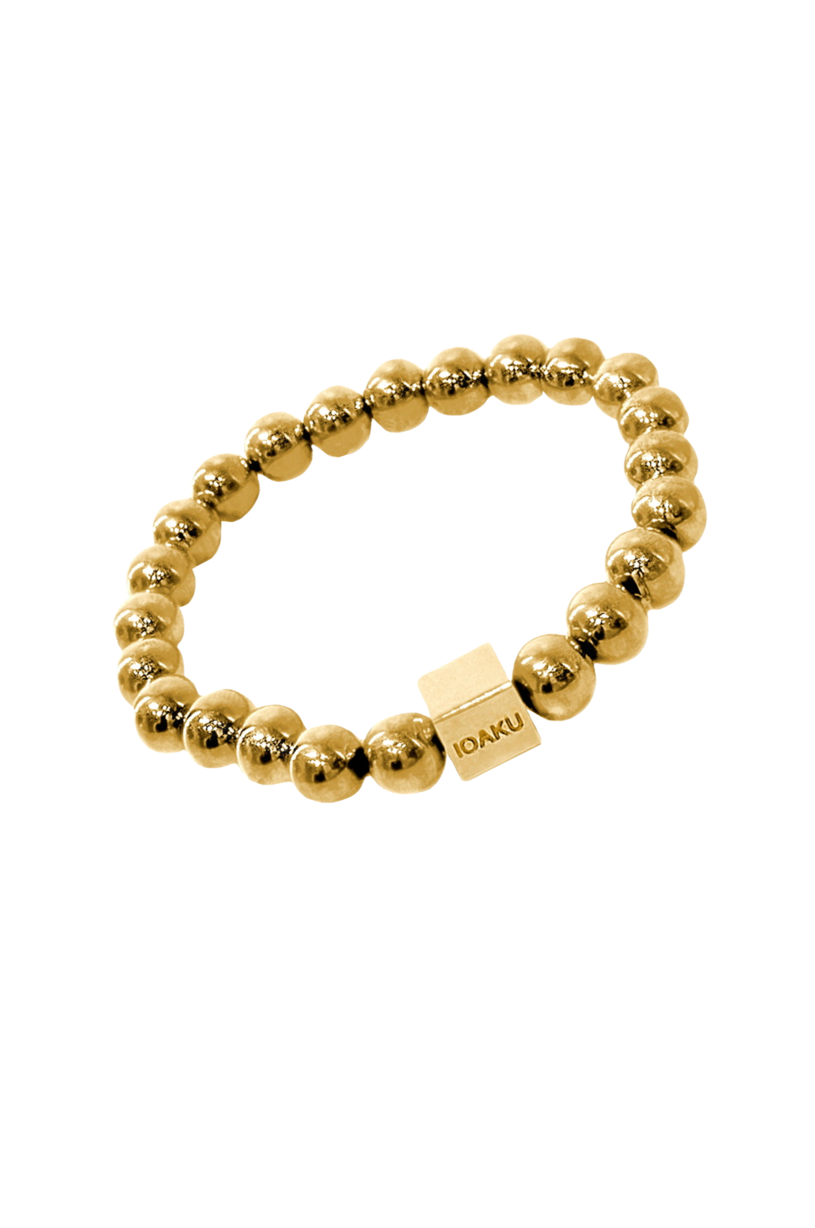Elastisk armbånd med kugler i kirurgisk rustfrit stål og fem lag PVD-belægning med ægte 18k guld/sølv, hvilket betyder at armbåndet kan tåle at du har det på i bad. Uden nikkel, bly og kadmium. Leveres i en eksklusiv æske fra IOAKU. Design af Fanny Ek.