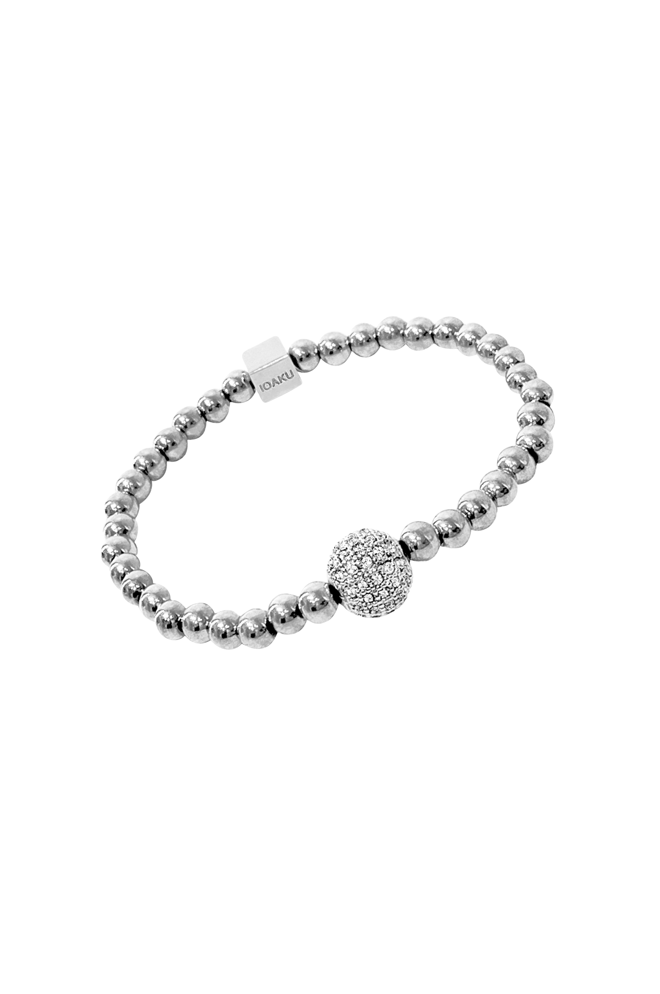 Elastisk armbånd med små kugler i kirurgisk rustfrit stål og fem lag PVD-belægning med ægte 18k guld/sølv, hvilket betyder at armbåndet kan tåle at du har det på i bad. Uden nikkel, bly og kadmium. Leveres i en eksklusiv æske fra IOAKU. Design af Fanny Ek.