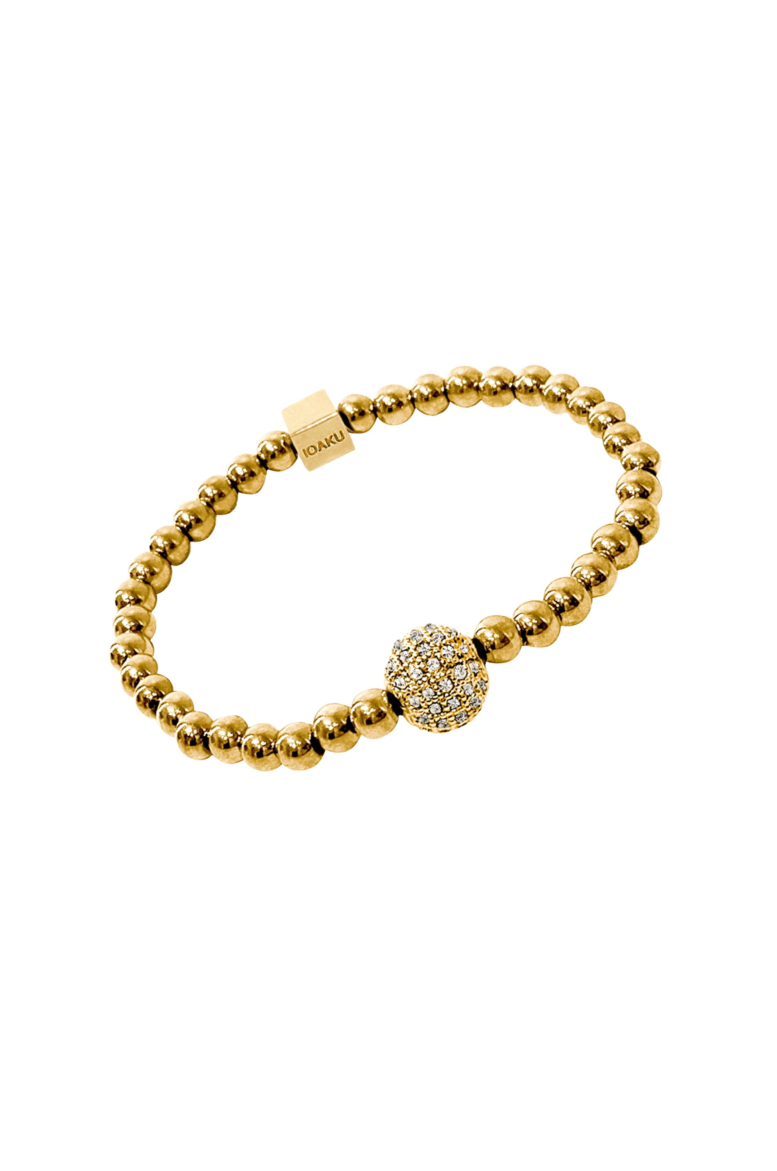 Elastisk armbånd med små kugler i kirurgisk rustfrit stål og fem lag PVD-belægning med ægte 18k guld/sølv, hvilket betyder at armbåndet kan tåle at du har det på i bad. Uden nikkel, bly og kadmium. Leveres i en eksklusiv æske fra IOAKU. Design af Fanny Ek.