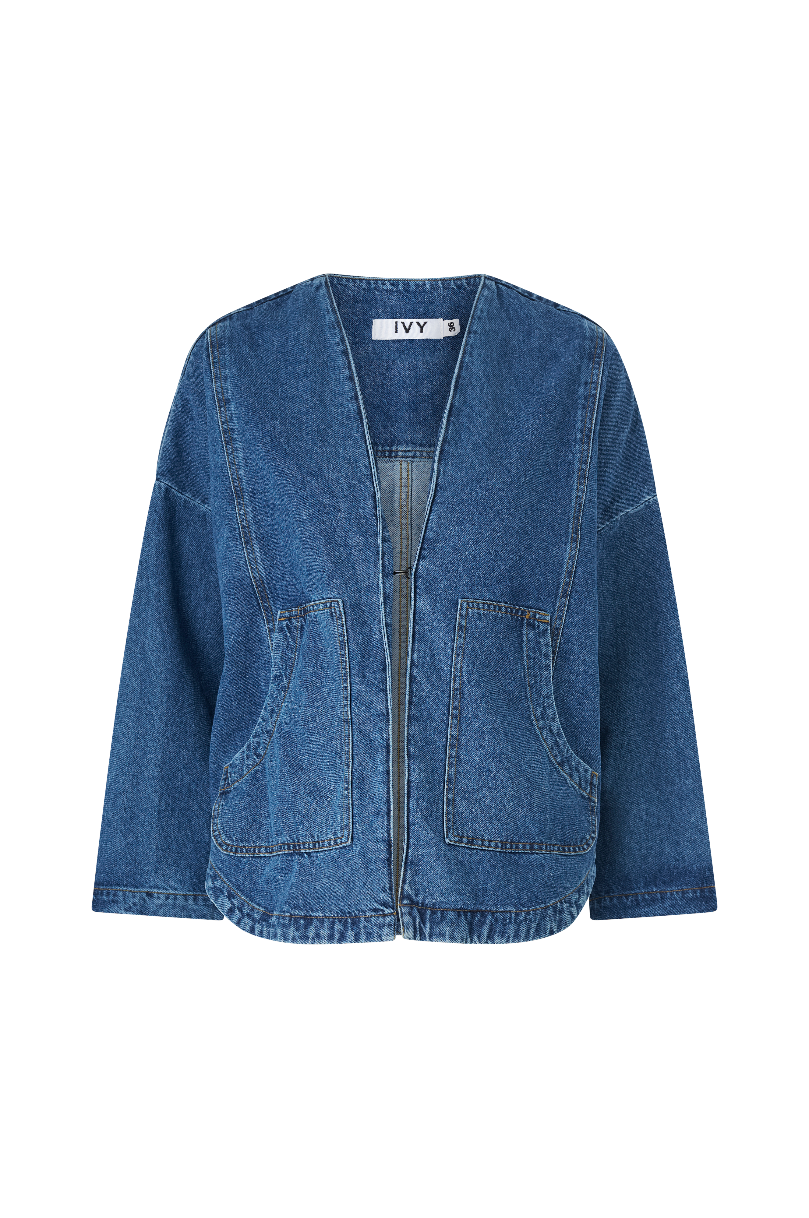 • Bred model i Tung denim• V-formet halsudskæring• En spændelukning på forkant med udviklingen• Store, påsyede lommer• Nedsænket skulder med langt, lige ærme• Afrundet søm• Længde: 66 cm i størrelse 36