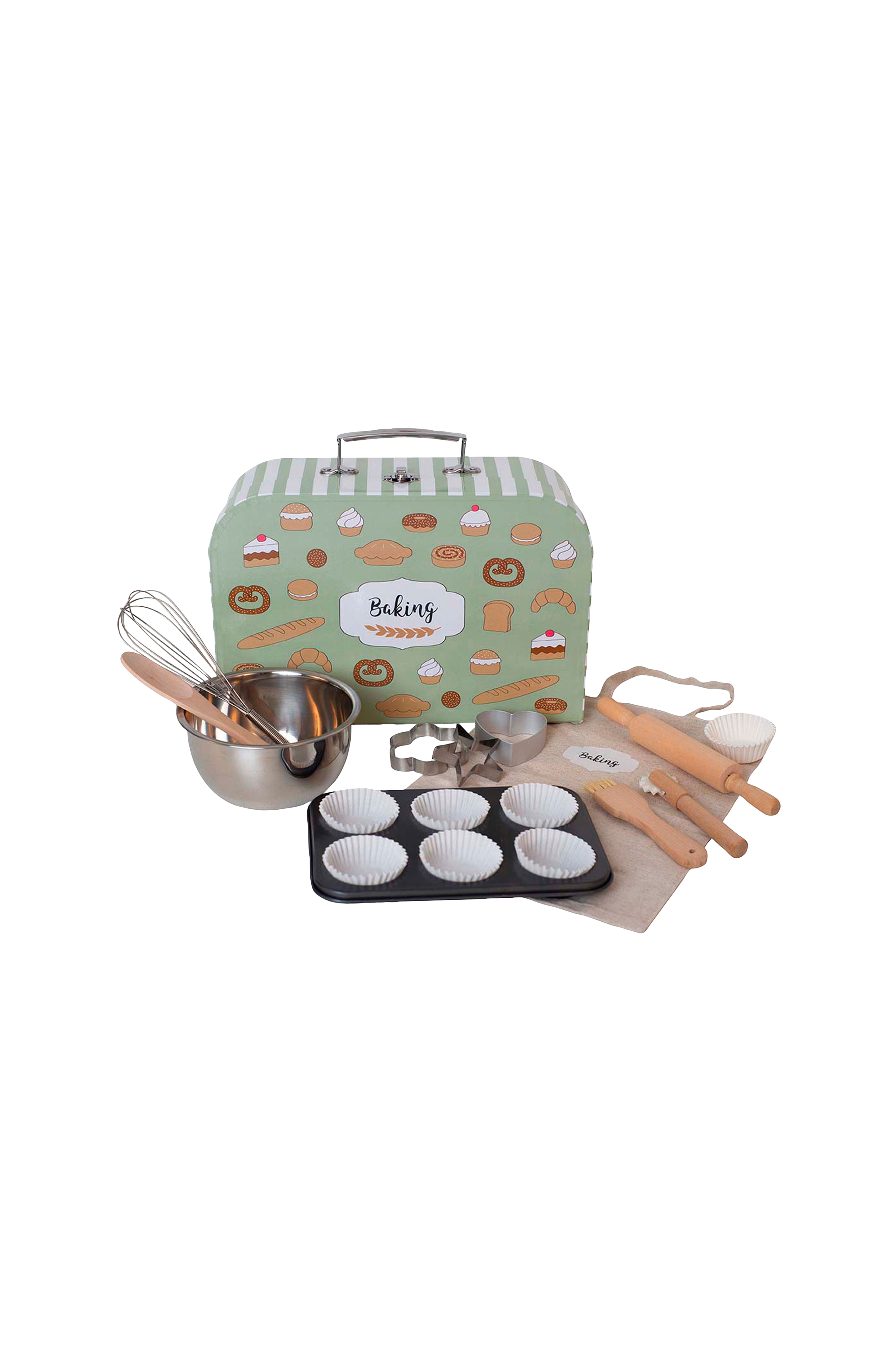 Sættet indeholder kagerulle, forme, bageplade og piskeris, alt sammen pakket i en sød paptaske med matchende bagepapir. Her er alt, hvad den lille bager kan få brug for i køkkenet, og sættet byder på mange timers sjov leg.