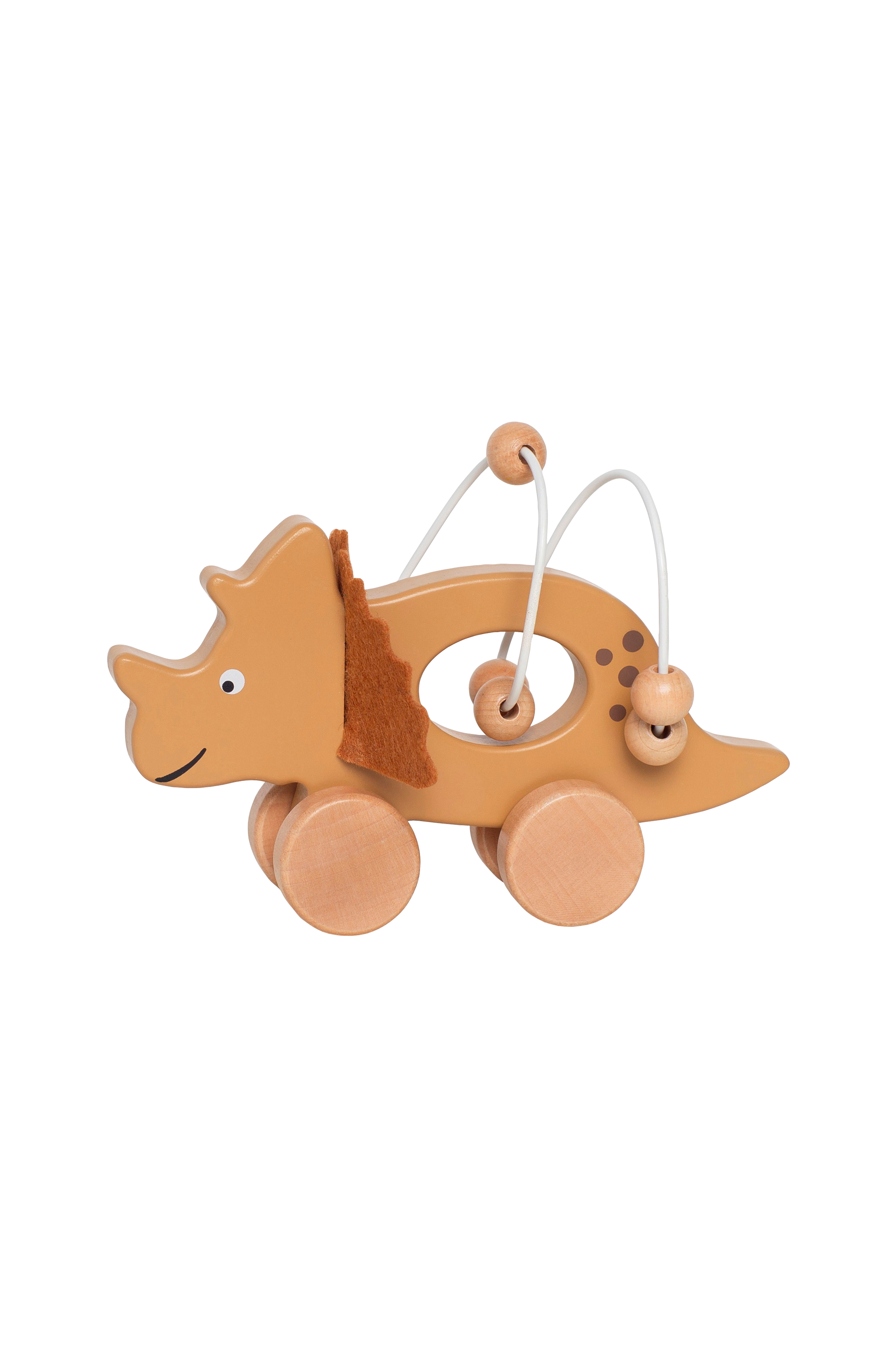 Dinosauren er designet til at være nem at gribe fat i, perfekt til små børnehænder. Med hjul som fødder ruller dinosauren hurtigt og nemt hen over både tæppe og gulv. Dinosauren har også en kugleramme rundt om sig med 5 små kugler, der nemt kan flyttes rundt.
