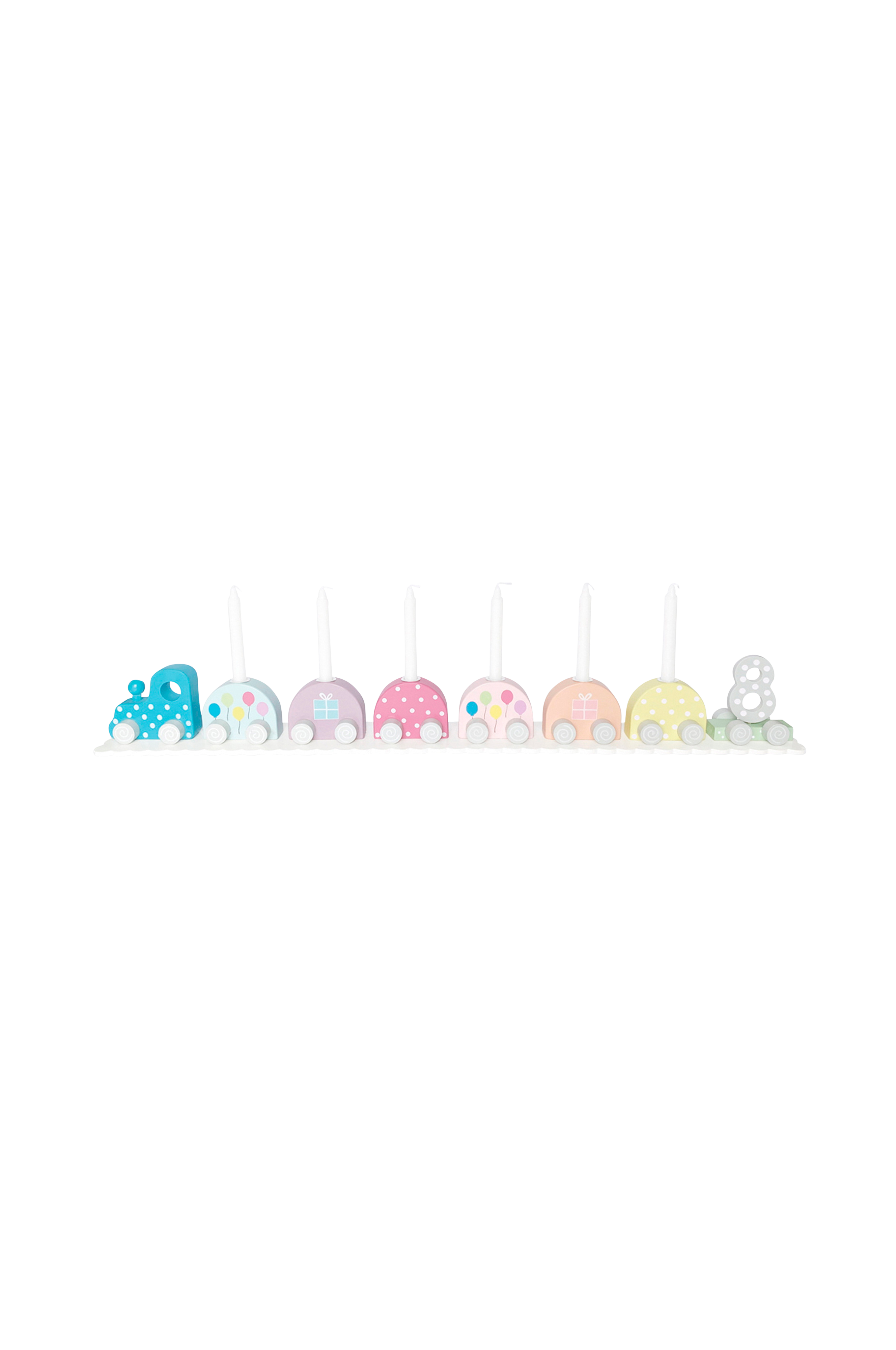 Fødselsdagslysestage i form af et tog med plads til lys. Hver vogn er pyntet med fine fødselsdagsmotiver. På sidste vogn sætter du et tal mellem 0-9 afhængigt af alderen. Tal medfølger.