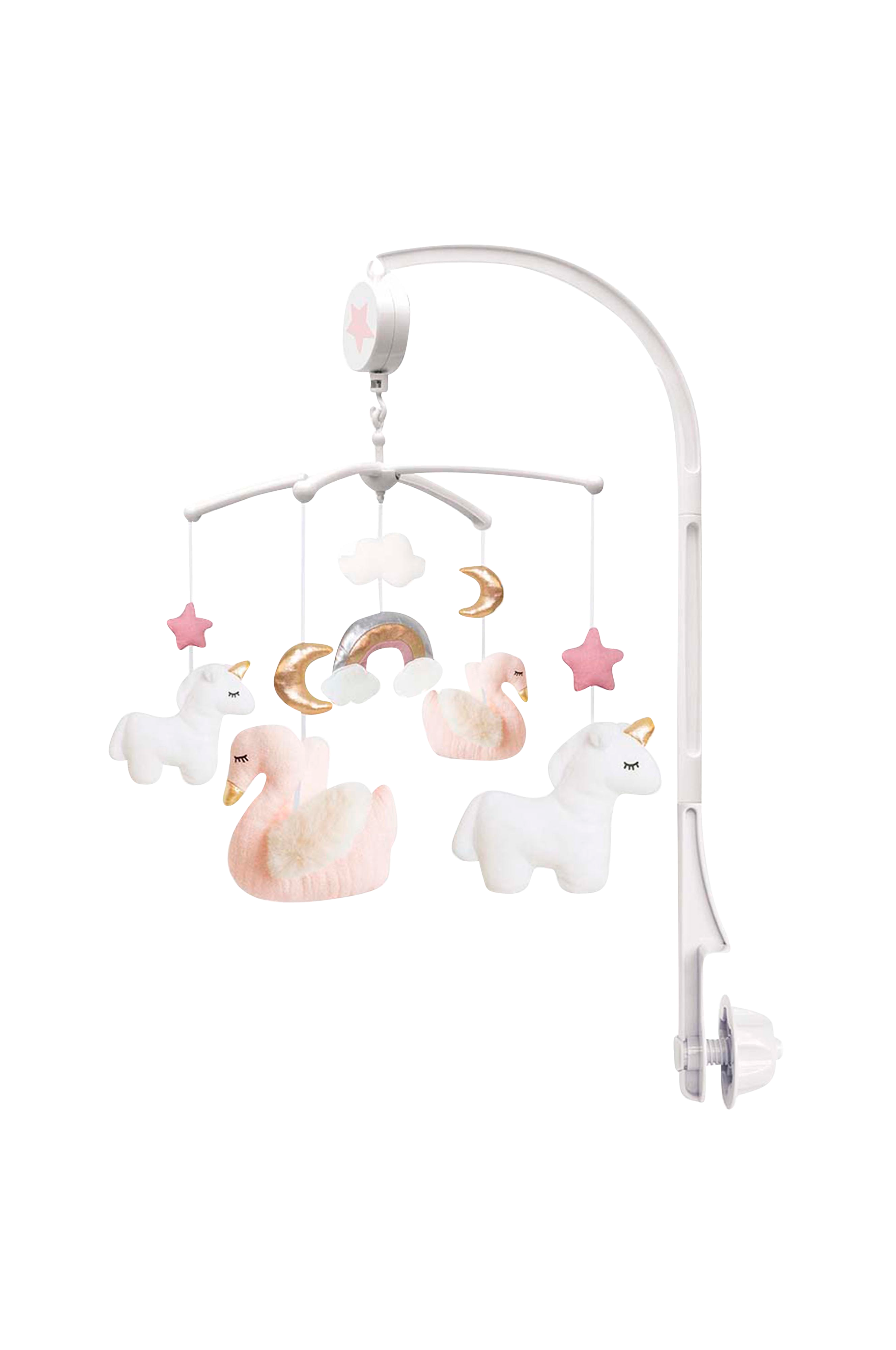 En sød musikuro i blød tekstil som spiller en vuggevise samtidigt med at figurerne drejer roligt rundt. Perfekt til at hænge over puslebordet eller tremmesengen. Uroen har søde figurer med svaner og enhjørninger og stimulerer både barnets syn og hørelse samtidigt med at barnet bliver beroliget.