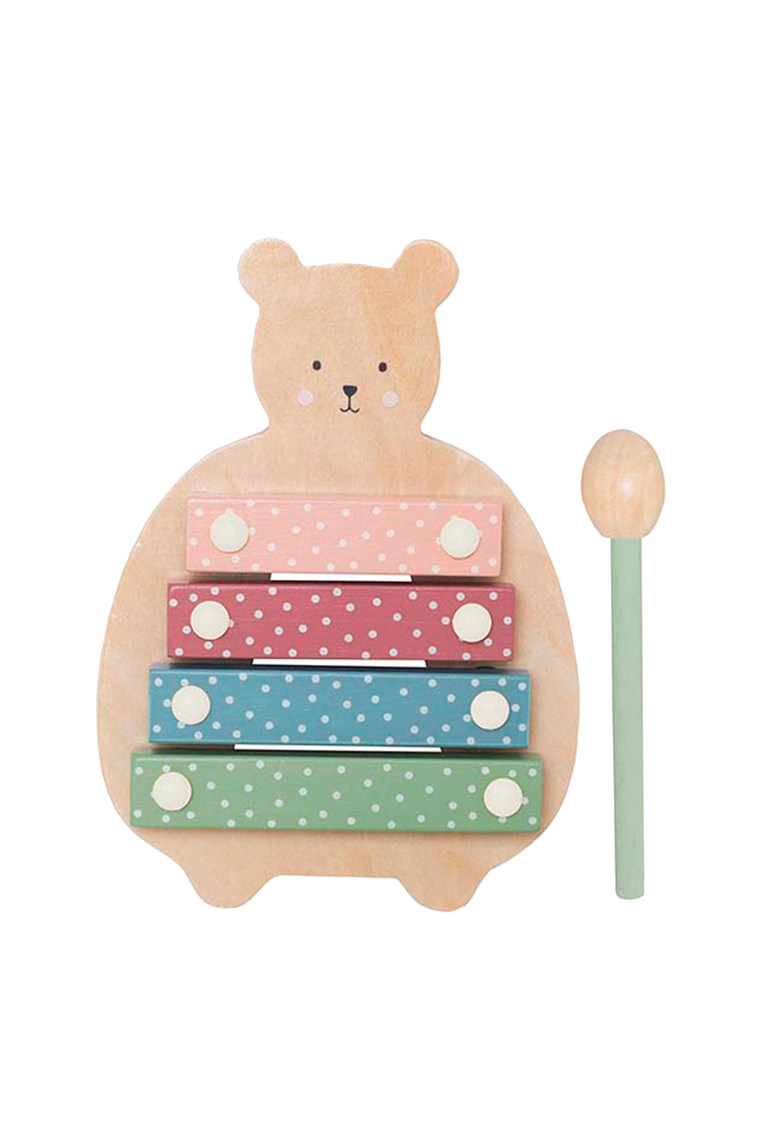 Xylofonen har 4 klangstave i forskellige farver og en medfølgende slagpind. Xylofonen er fremstillet i træ, som giver en blødere lyd end klassisk metal. Den er også udskåret som en sød bamse for ekstra glæde og leg.