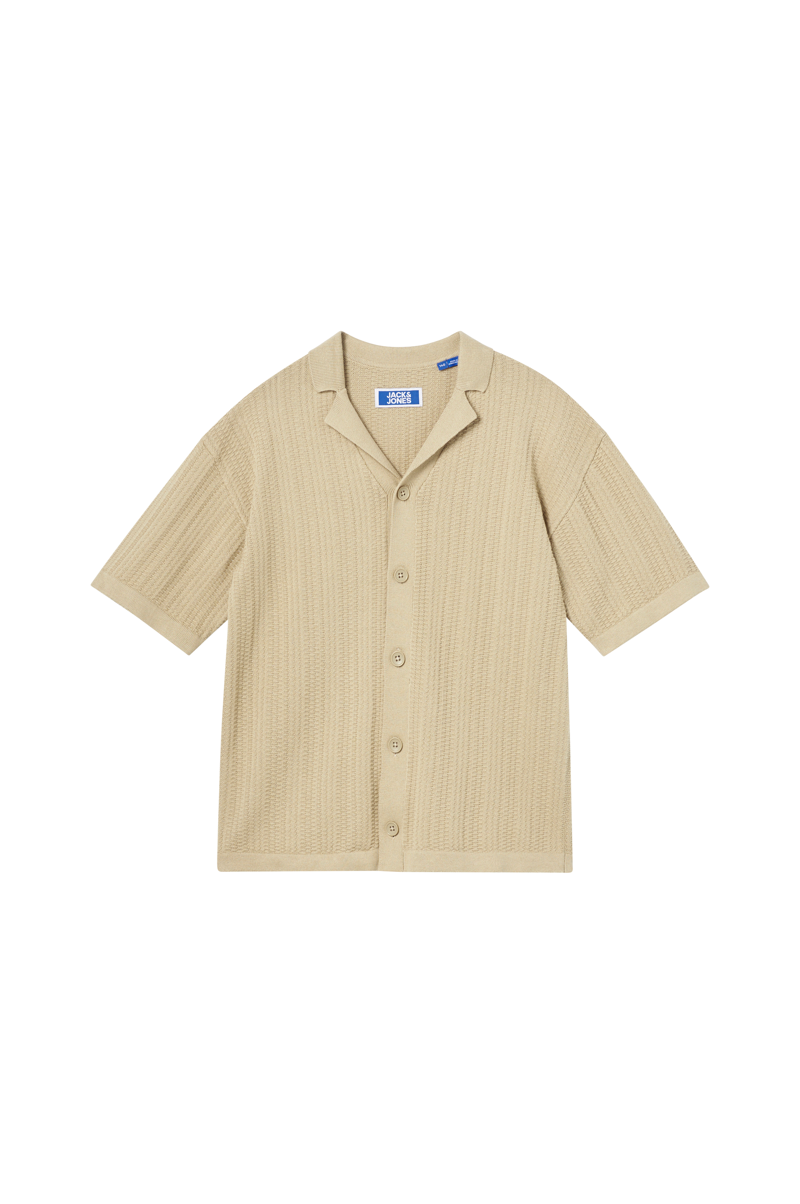 • Strukturstrikket trøje• Korte ærmer med ribkanter• Ribbet krave• Knapper• Ribbet søm