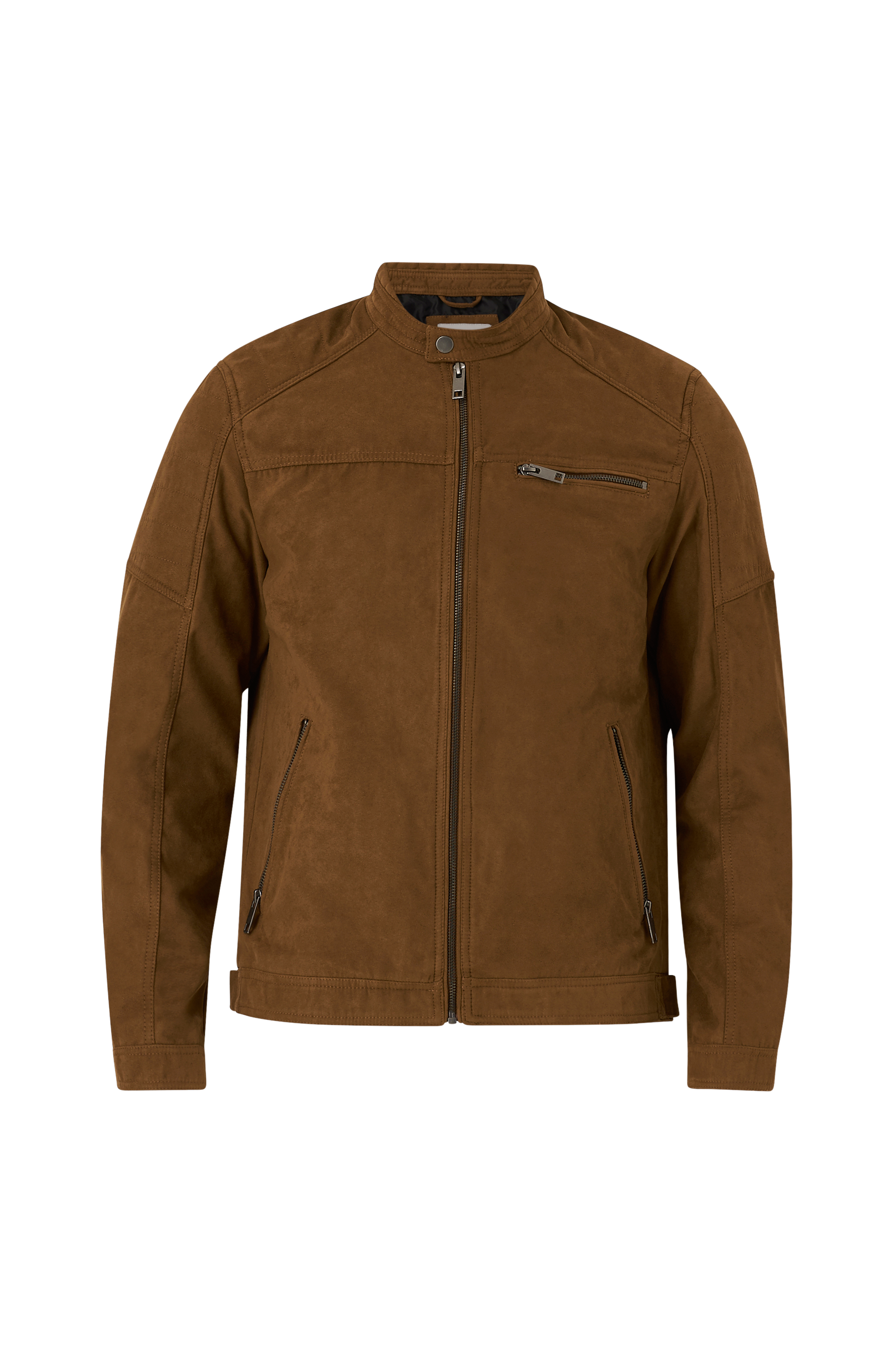 Bikerjakke jcoRocky Jacket fra Jack & Jones i imiteret skind med vatteret parti med sømme på skuldre og overarme. Lynlås og to lynlåslommer foran samt en brystlomme med lynlås. Justerbare stropper med trykknap i siderne forneden. Længde ca. 66 cm i str. M.