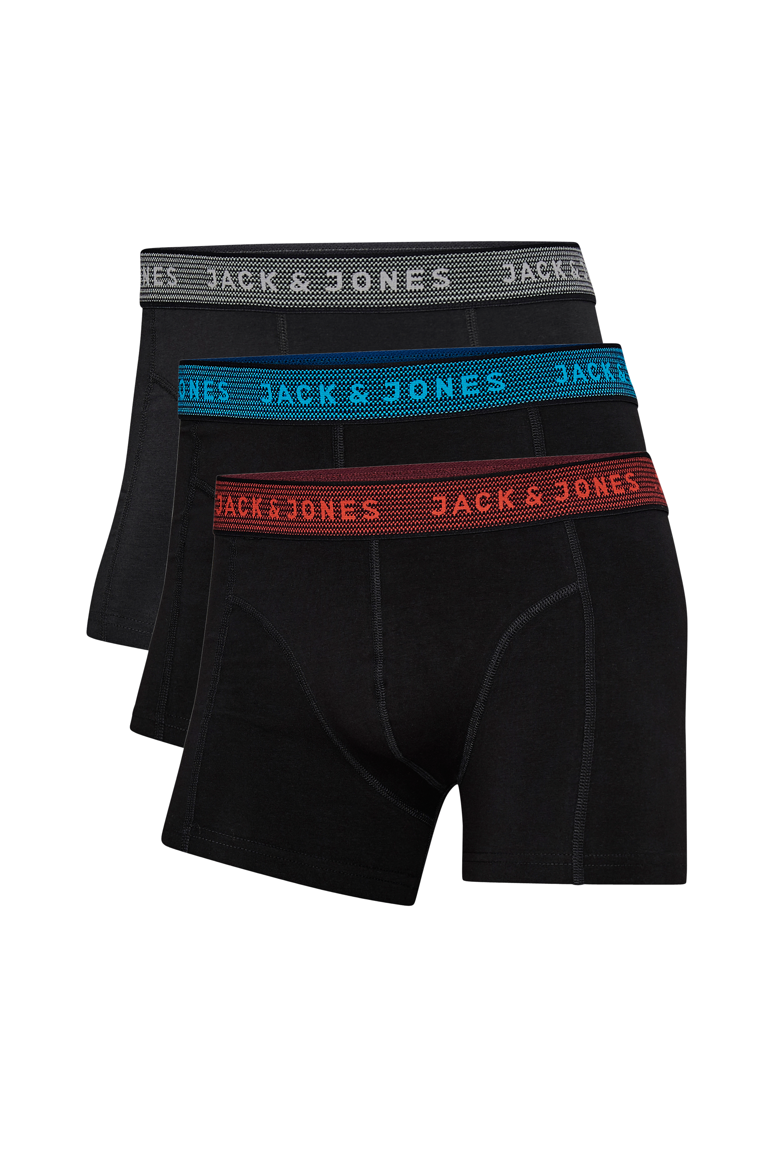 Boxershorts jacWaistband Trunk 3-pak fra Jack & Jones. Tre sorte. Påsyet elastiklinning med Jack & Jones-logo. Foret skridt.