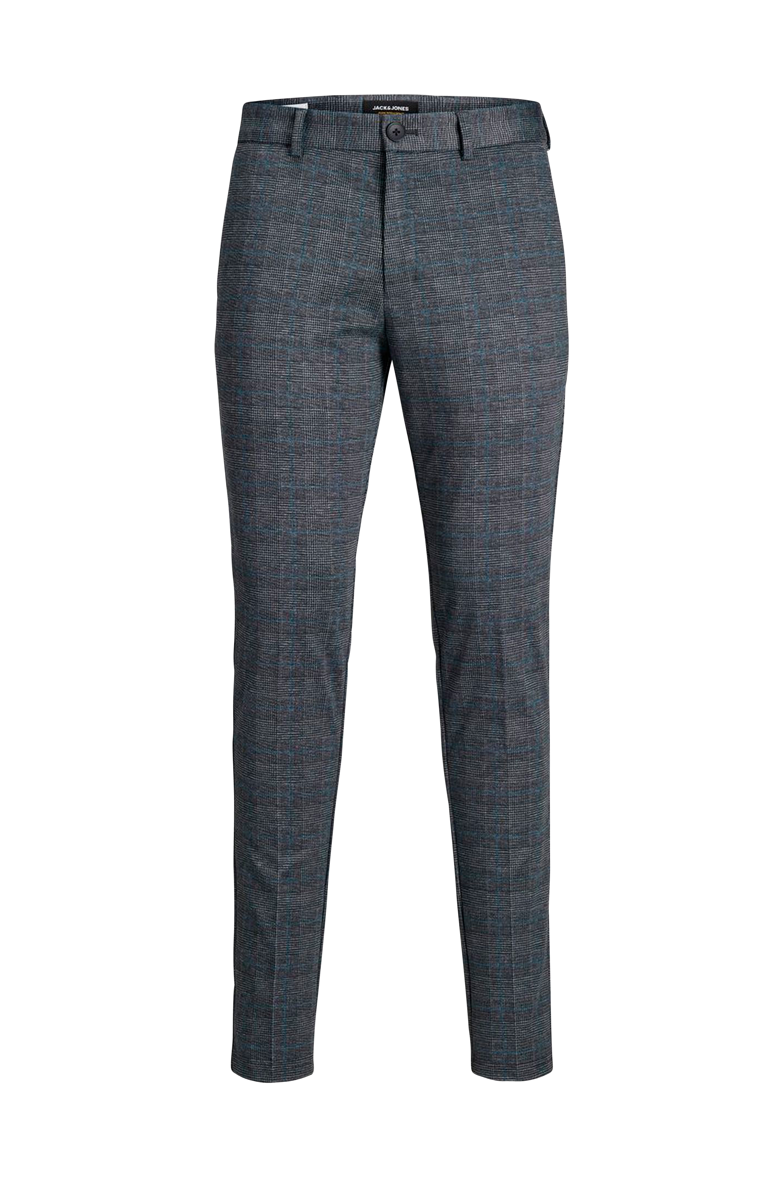 Bukser jjiMarco jjPhil Jersey Nor DG Check fra Jack & Jones i stretchjersey. Smal pasform. Linning med stropper og knap. Lynlåsgylp. To lommer foran og to paspolerede lommer bagpå med knap.