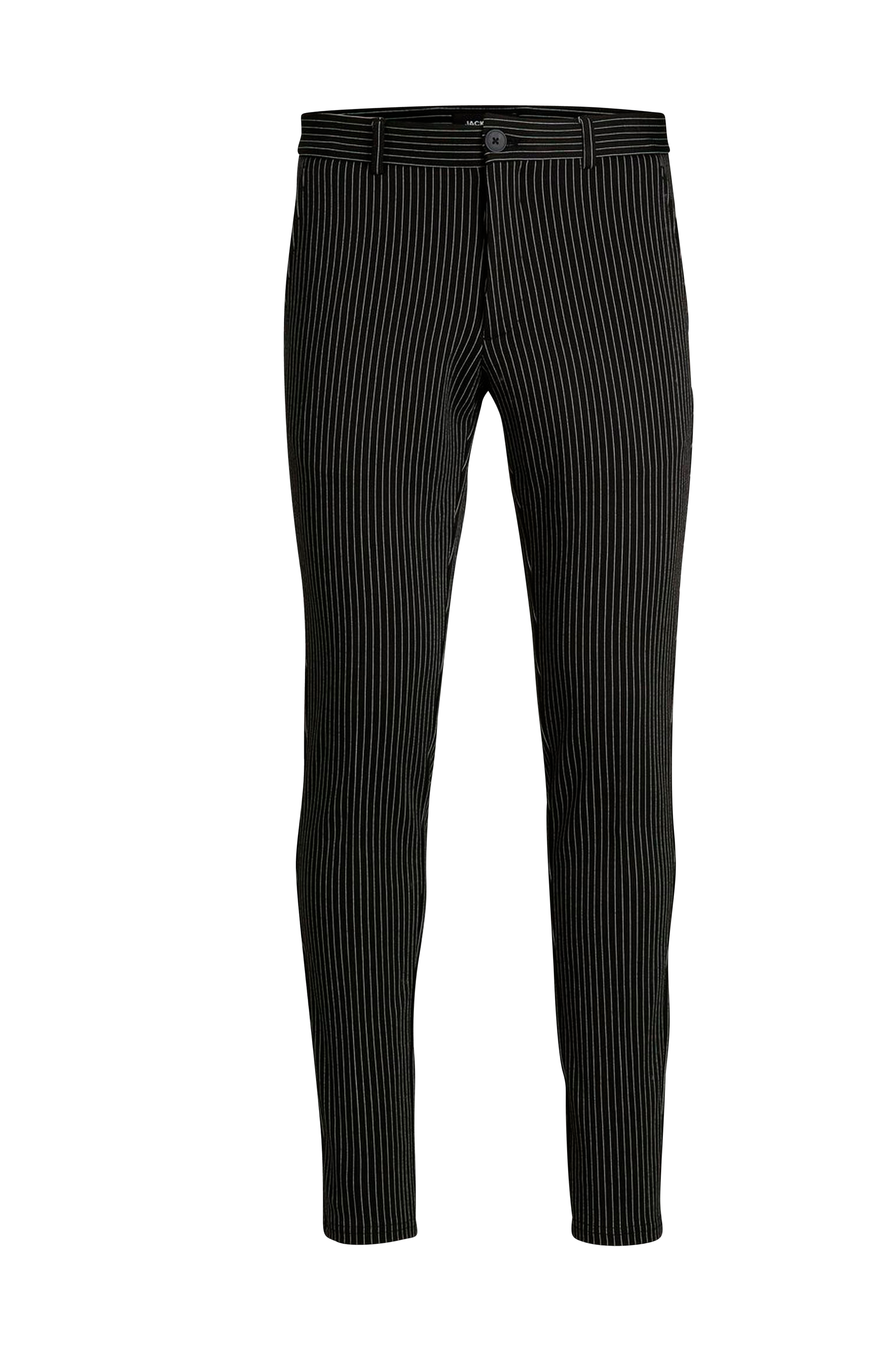Bukser jjiMarco jjPhil Jersey fra Jack & Jones i stretchjersey med smalle nålestriber. Smal pasform. Linning med stropper og knap. Lynlåsgylp. To lommer foran og to paspolerede lommer bagpå med knap.