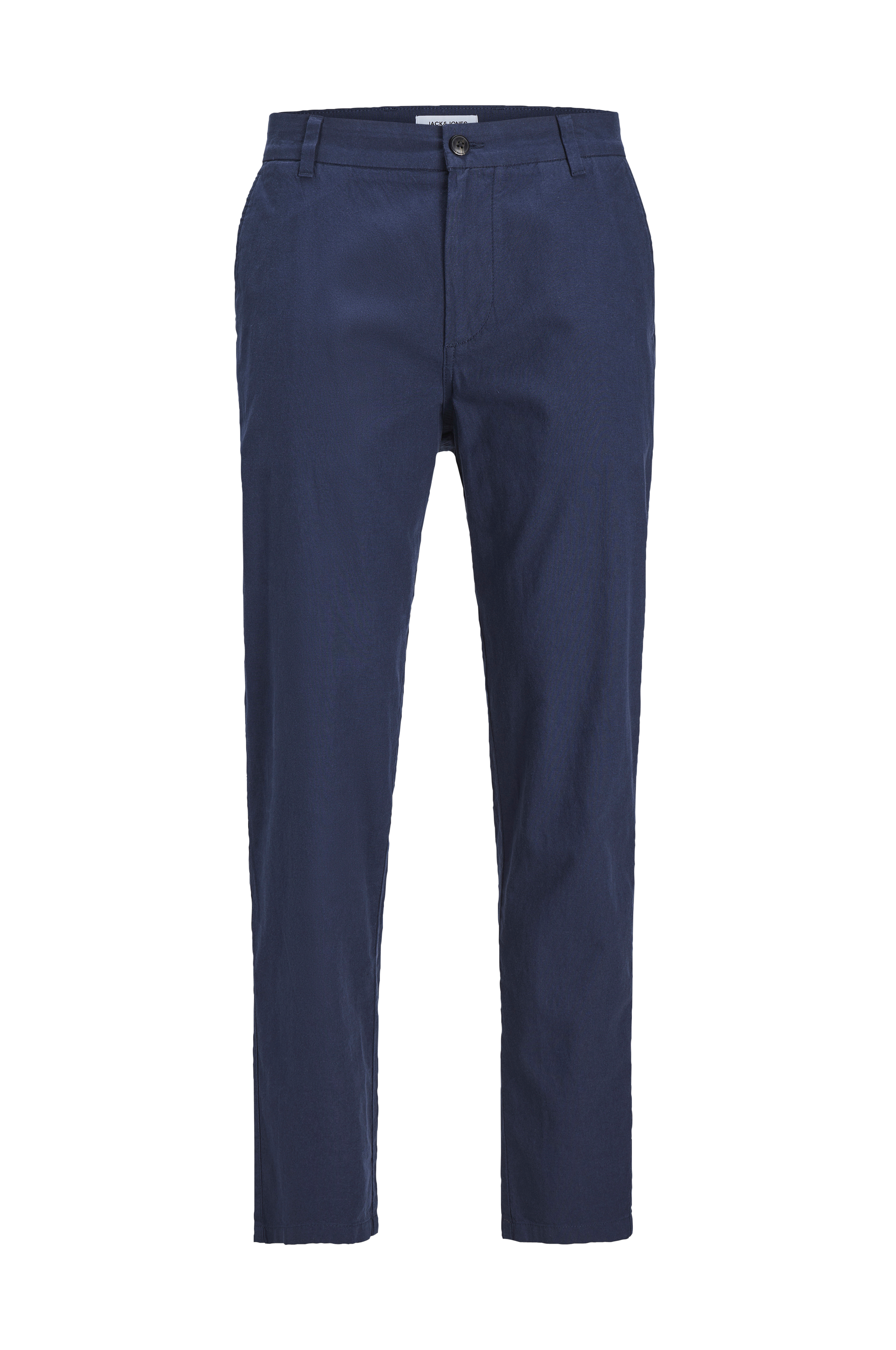 • Bukser i hørblanding• Indsnævrende ben• Stropper• Knaplukning• Gylp med lynlås• Sidelommer• To paspolerede lommer bagpå med knap