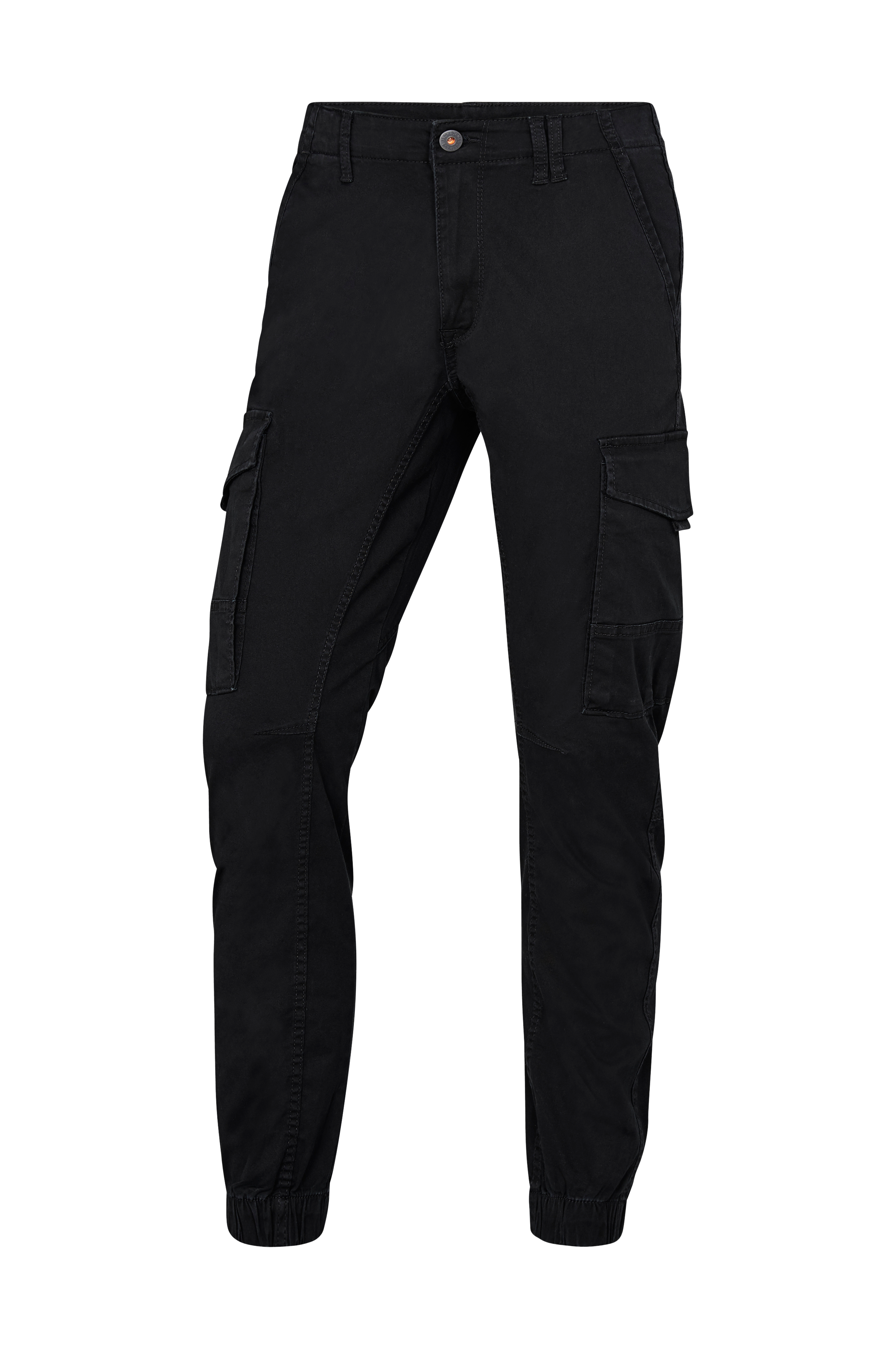 Cargobuks jjiPaul jjFlake AKM 542 fra Jack & Jones i blød, vævet stretchkvalitet. Tapered fit, rummelig pasform foroven og bukseben der bliver smallere nedefter. Linning med bæltestropper, knap og gylp med lynlås. Tre lommer foran og to baglommer med snydeklap og knap. To benlommer med lommeklap og skjult trykknap. Elastik i benkanten.
