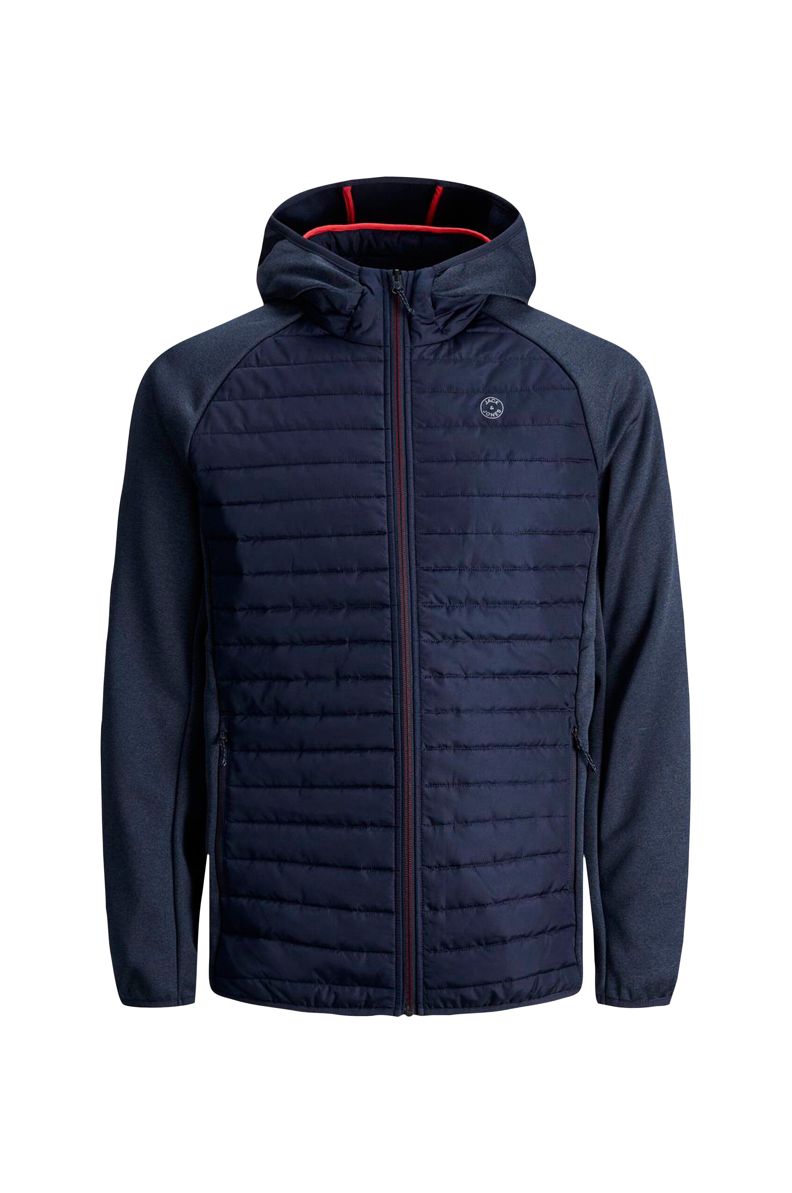En let hybridjakke med quiltet og vatteret for- og bagside. Hætte, ærmer og sider i jerseymateriale med blød, børstet inderside. Høj krave, lynlås og to lommer med lynlås. Elastiske kantbånd i ærmet og forneden. Længde ca. 71 cm i str. M.