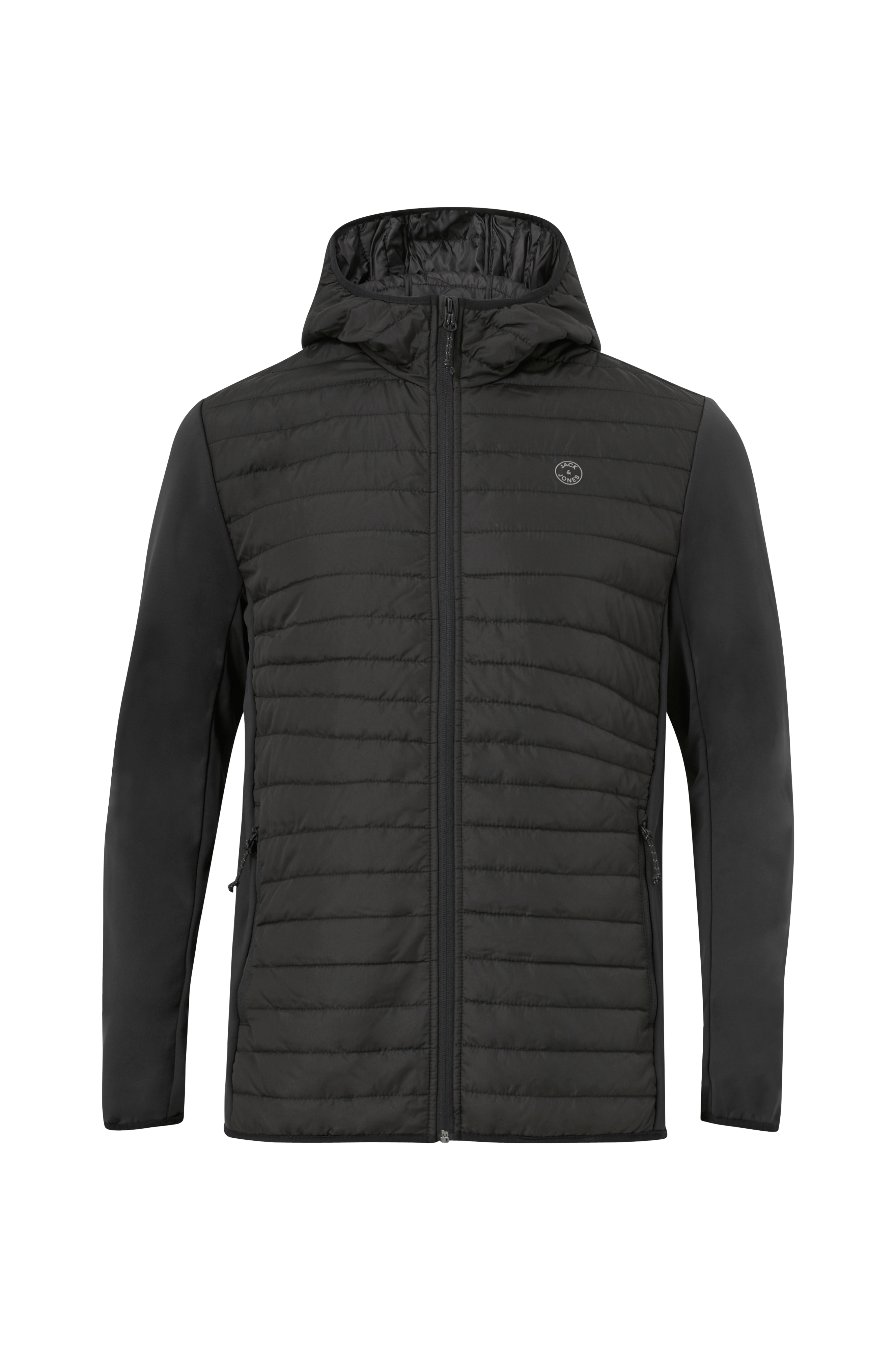 En let hybridjakke med quiltet og vatteret for- og bagside. Hætte, ærmer og sider i jerseymateriale med blød, børstet inderside. Høj krave, lynlås og to lommer med lynlås. Elastiske kantbånd i ærmet og forneden. Længde ca. 71 cm i str. M.