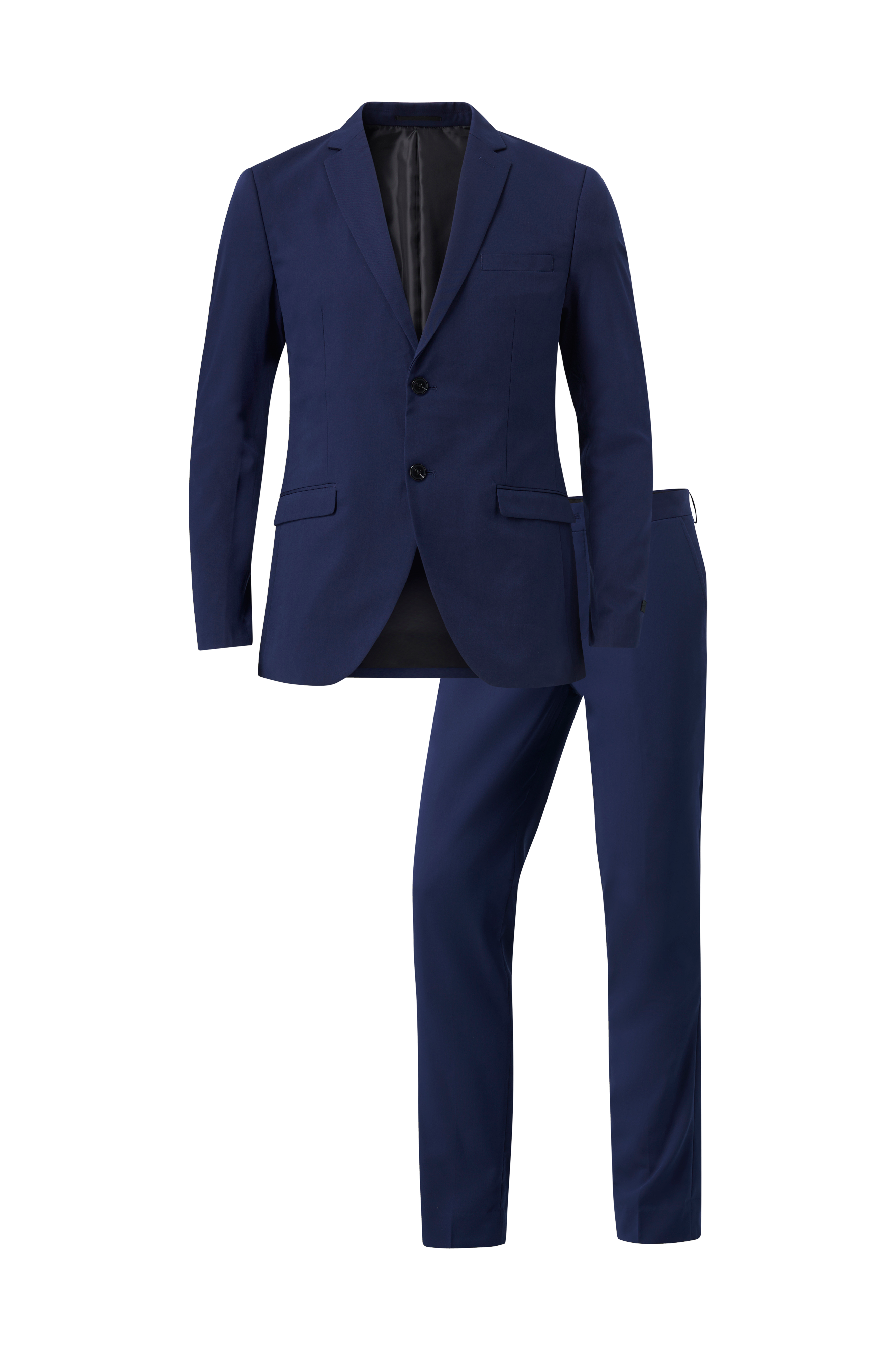 Todelt jakkesæt i klassisk design med supersmal pasform. Blazer med to knapper. Fire pynteknapper i ærmekanten. To lommer med lommeklap og en brystlomme. To inderlommer med knap. To slidser forneden bagpå. Længde ca. 75 cm i str. 50. Bukserne har sidelommer og baglommer. Gylp med lynlås. Indvendig benlængde ca. 78 cm i str. 48.