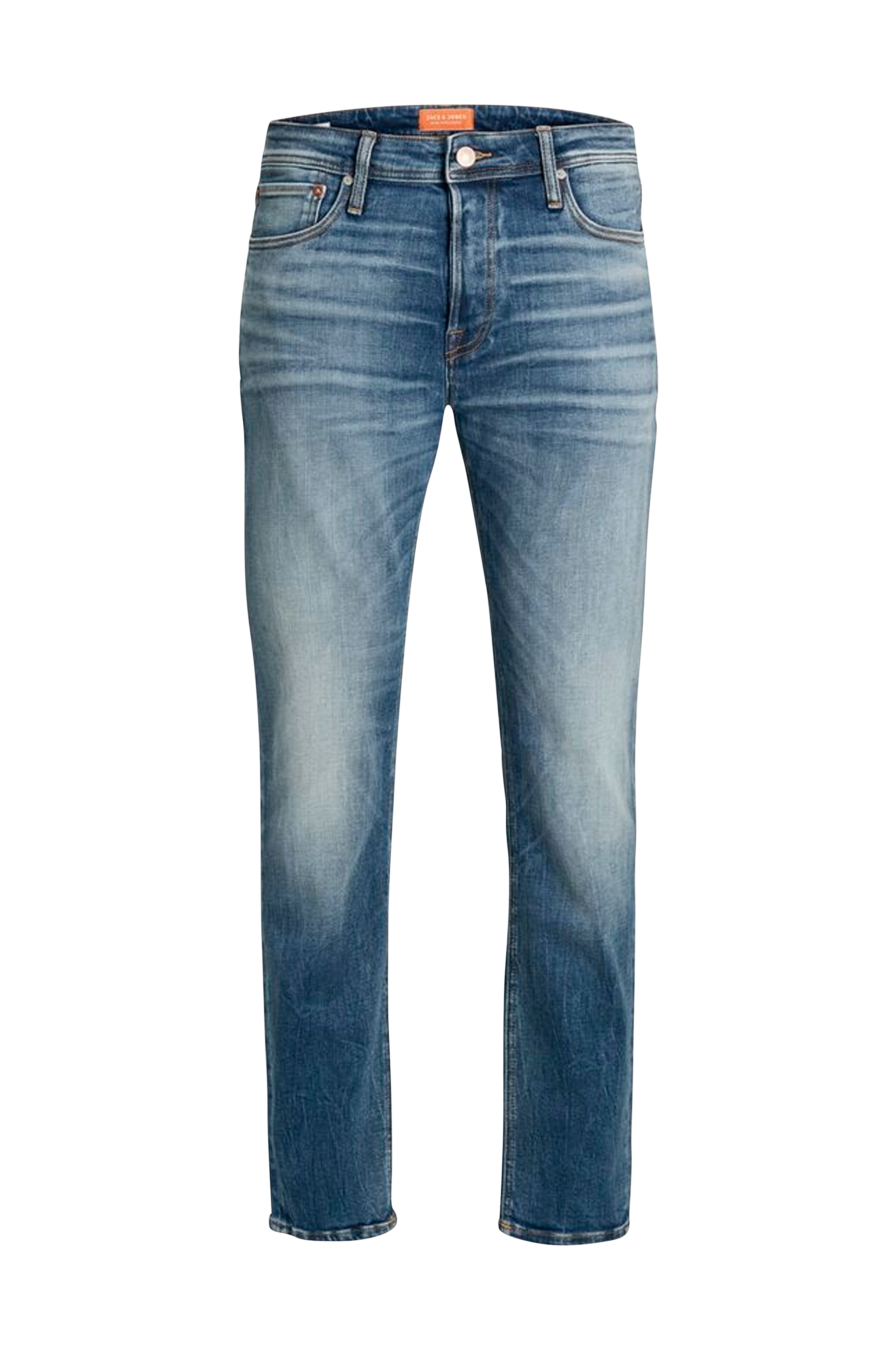 Jeans jjiMike jjOriginal JOS 411 fra Jack & Jones. Model med normalhøj talje som har knapper i gylpen samt fem klassiske jeanslommer. Lige ben med bukseben, der bliver lidt smallere nedefter.