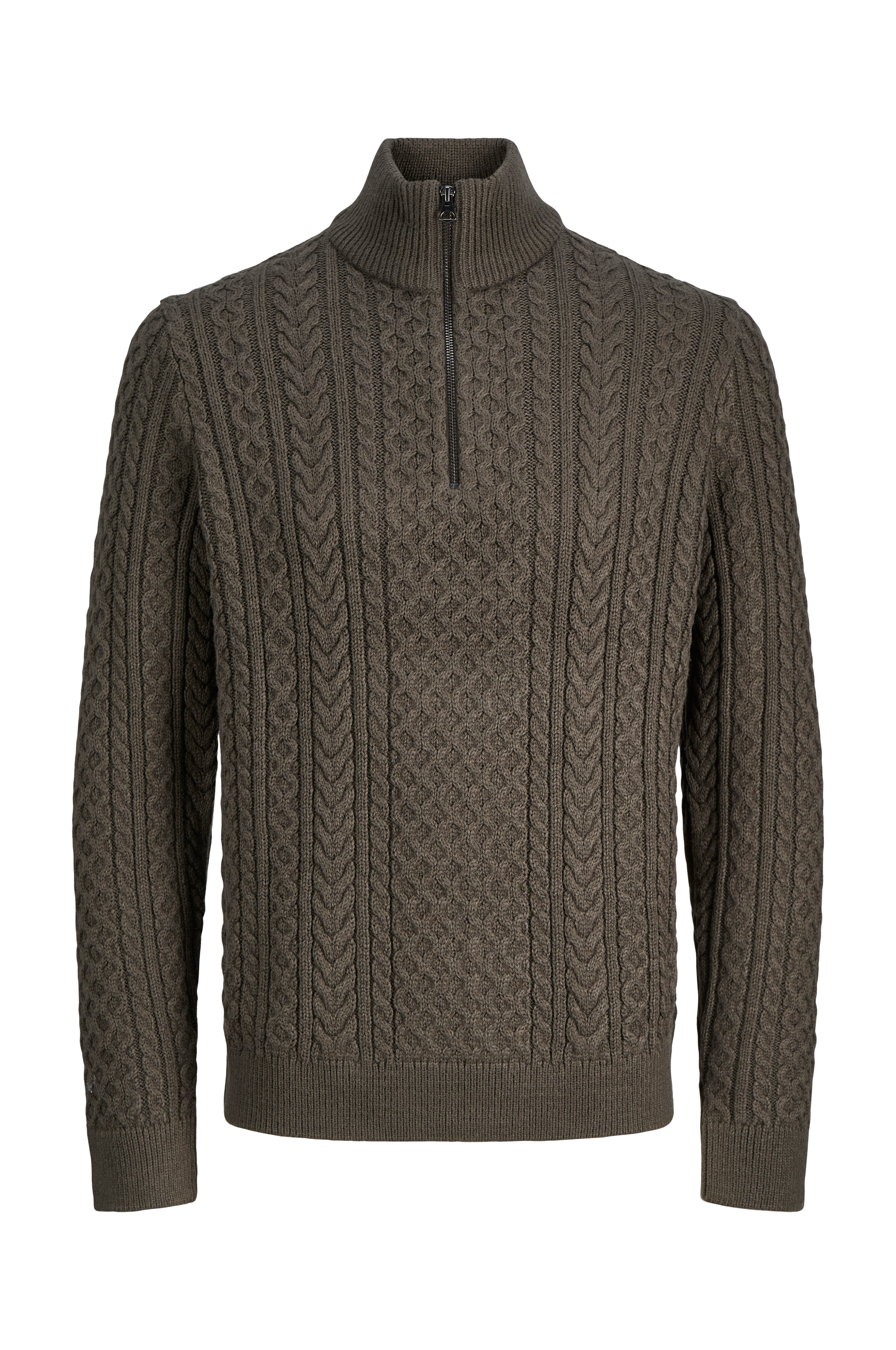 • Blød, kabelstrikket Pullover• Ribmanchetter ved manchetterne og nederst• Opretstående krave• Halvlang lynlås foran