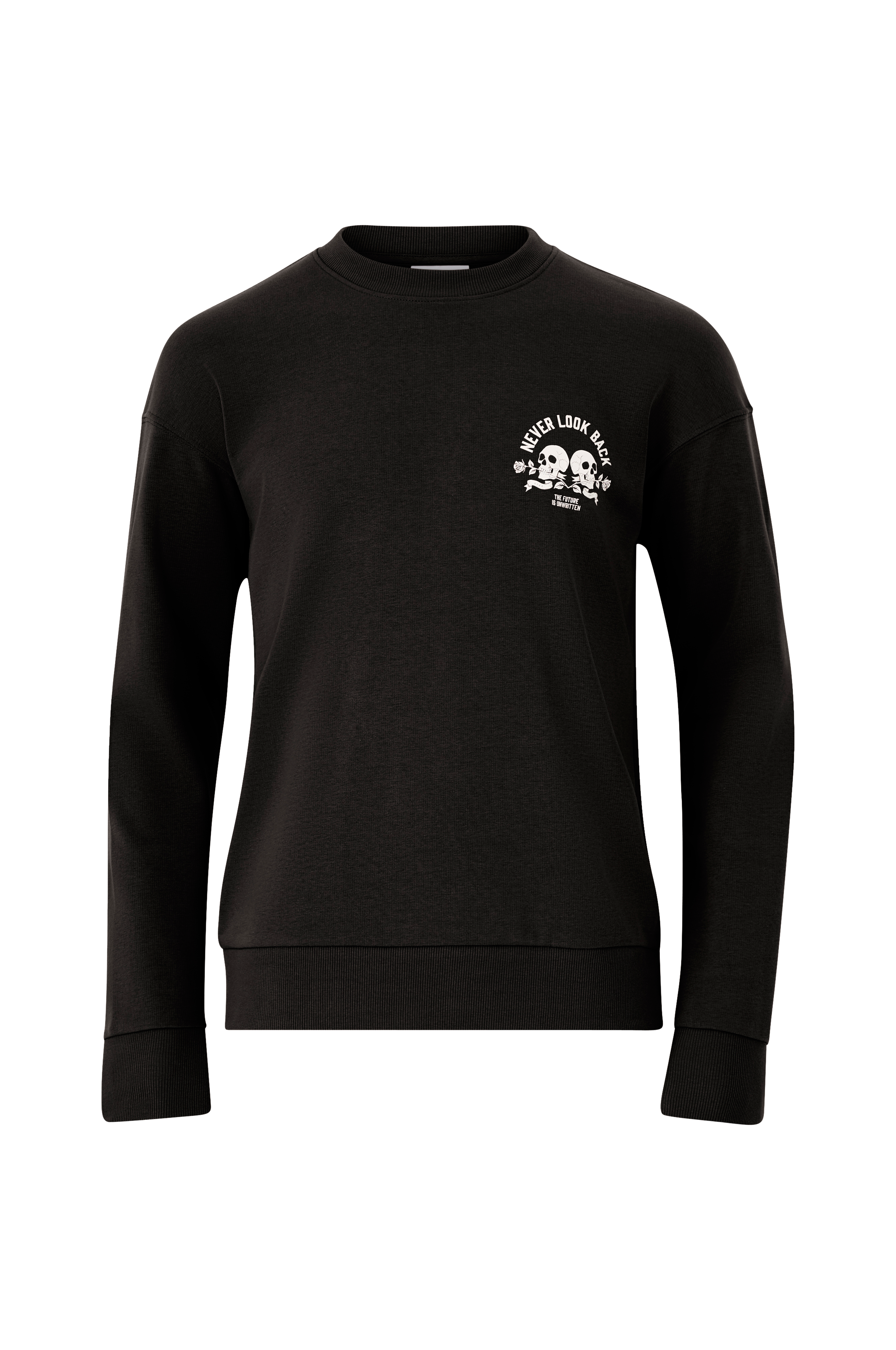 • Rund, ribbet halsudskæring• Stort tryk på ryggen• Tryk foran• Ribmanchetter ved manchetterne og nederst