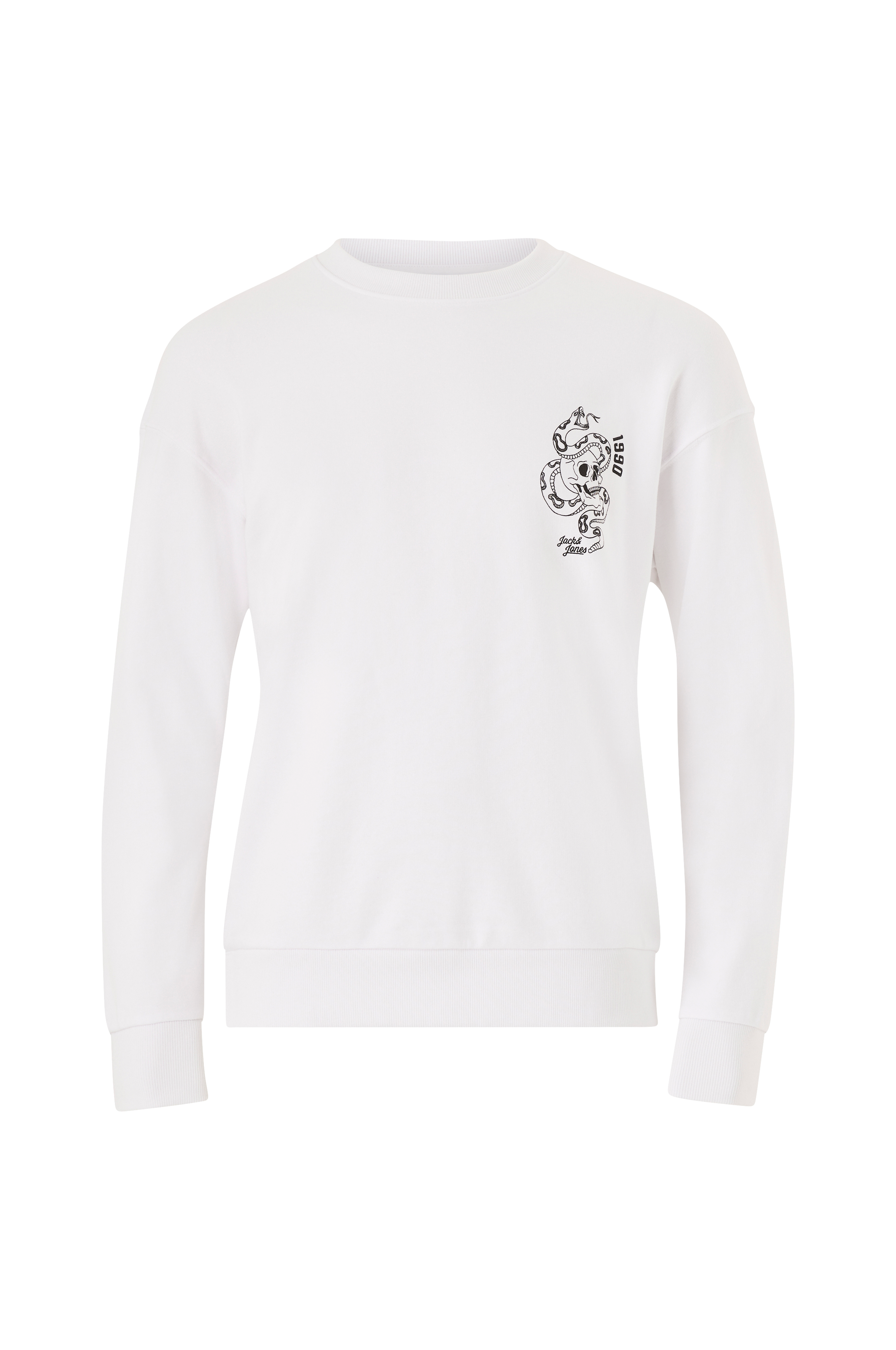 • Rund, ribbet halsudskæring• Stort tryk på ryggen• Tryk foran• Ribmanchetter ved manchetterne og nederst