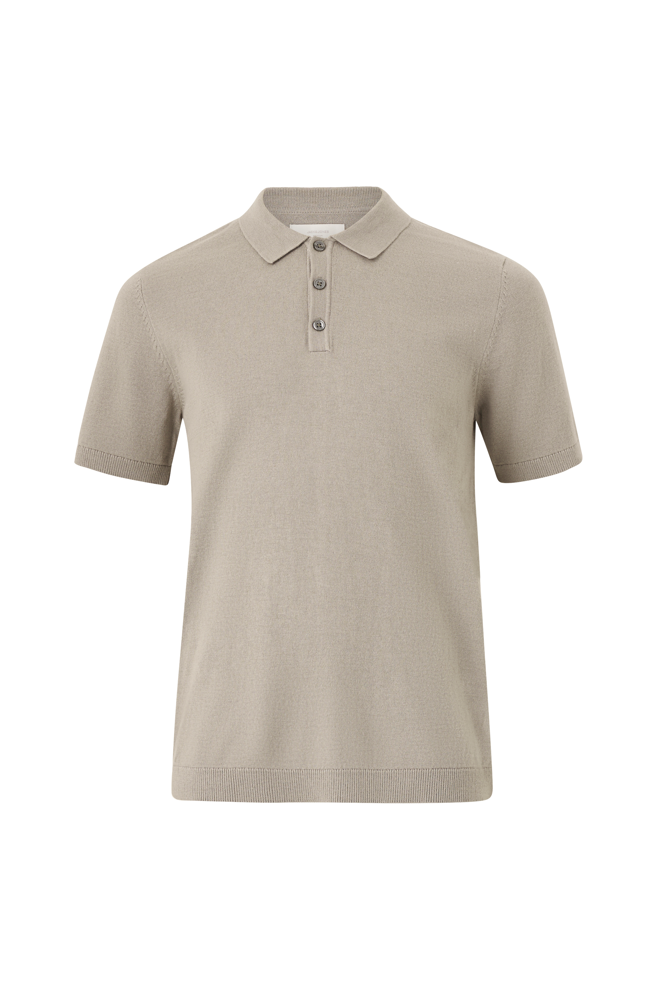 • Korte ærmer med ribkanter ved ærmeafslutningerne• Fintstrikket• Ribbet krave• Tre knapper
