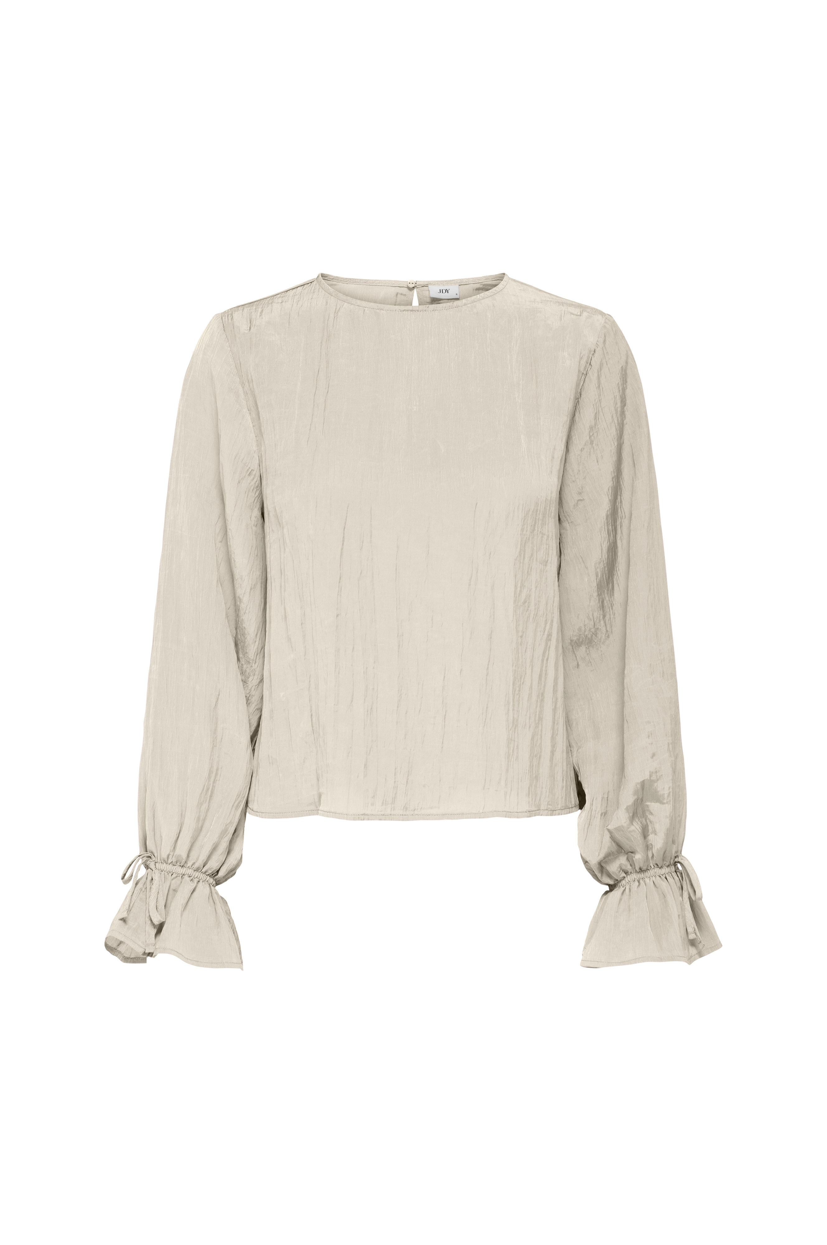 • Tynd, skinnende bluse med let krøllet struktur• Rund halsudskæring• Nøglehulsåbning med knaplukning i nakken• Lange ærmer med elastik og bindebånd ved ærmeafslutningerne• Volant ved manchetterne
