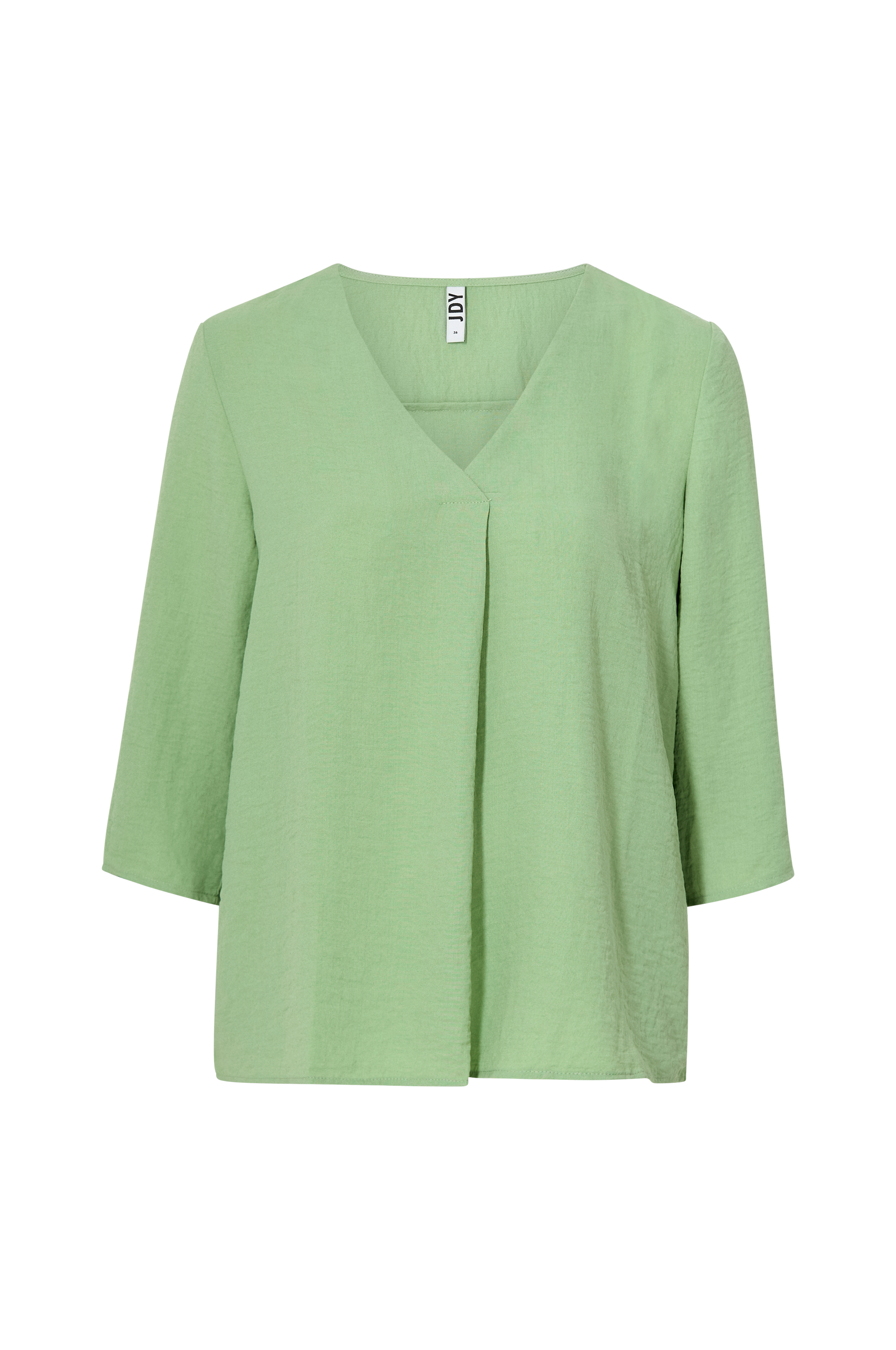 Bluse i blød, vævet kvalitet med let struktur i stoffet. V-hals og læg foran. Ærme i 3/4-længde som kan rulles op og fastgøres med knaptamp. Noget længere bagpå.