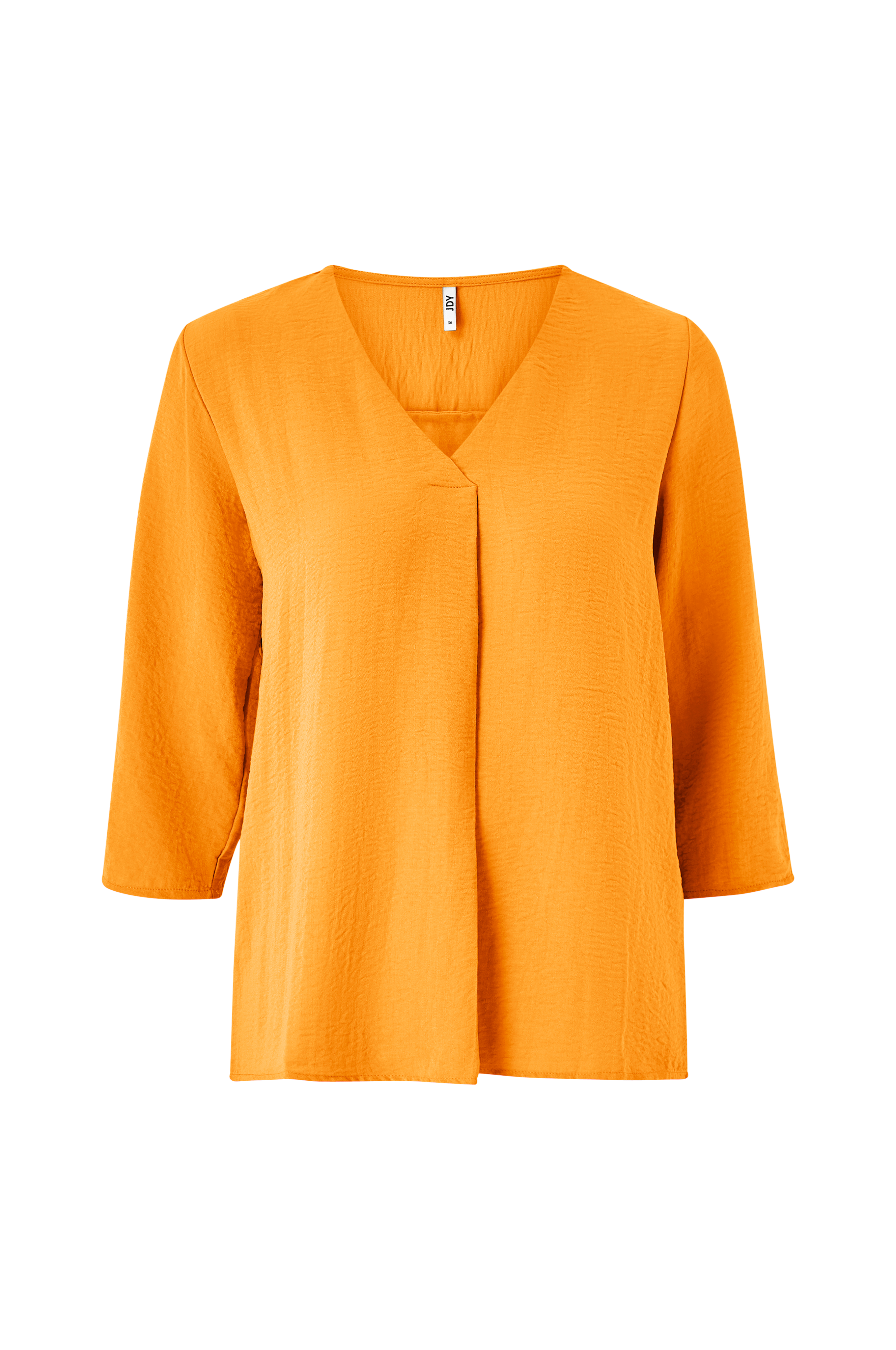 Bluse i blød, vævet kvalitet med let struktur i stoffet. V-hals og læg foran. Ærme i 3/4-længde som kan rulles op og fastgøres med knaptamp. Noget længere bagpå.
