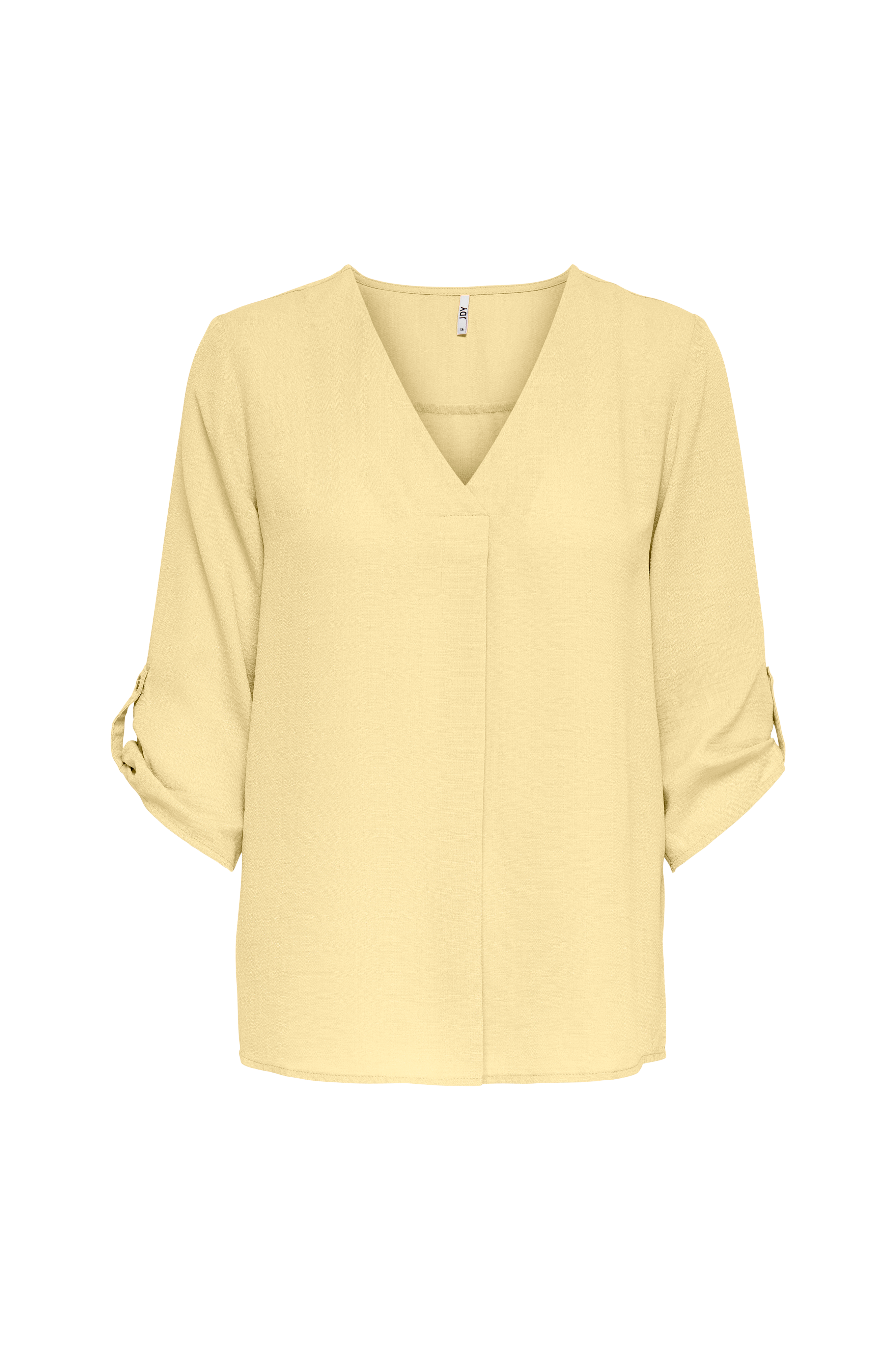 Bluse i blød, vævet kvalitet med let struktur i stoffet. V-hals og læg foran. Ærme i 3/4-længde som kan rulles op og fastgøres med knaptamp. Noget længere bagpå.