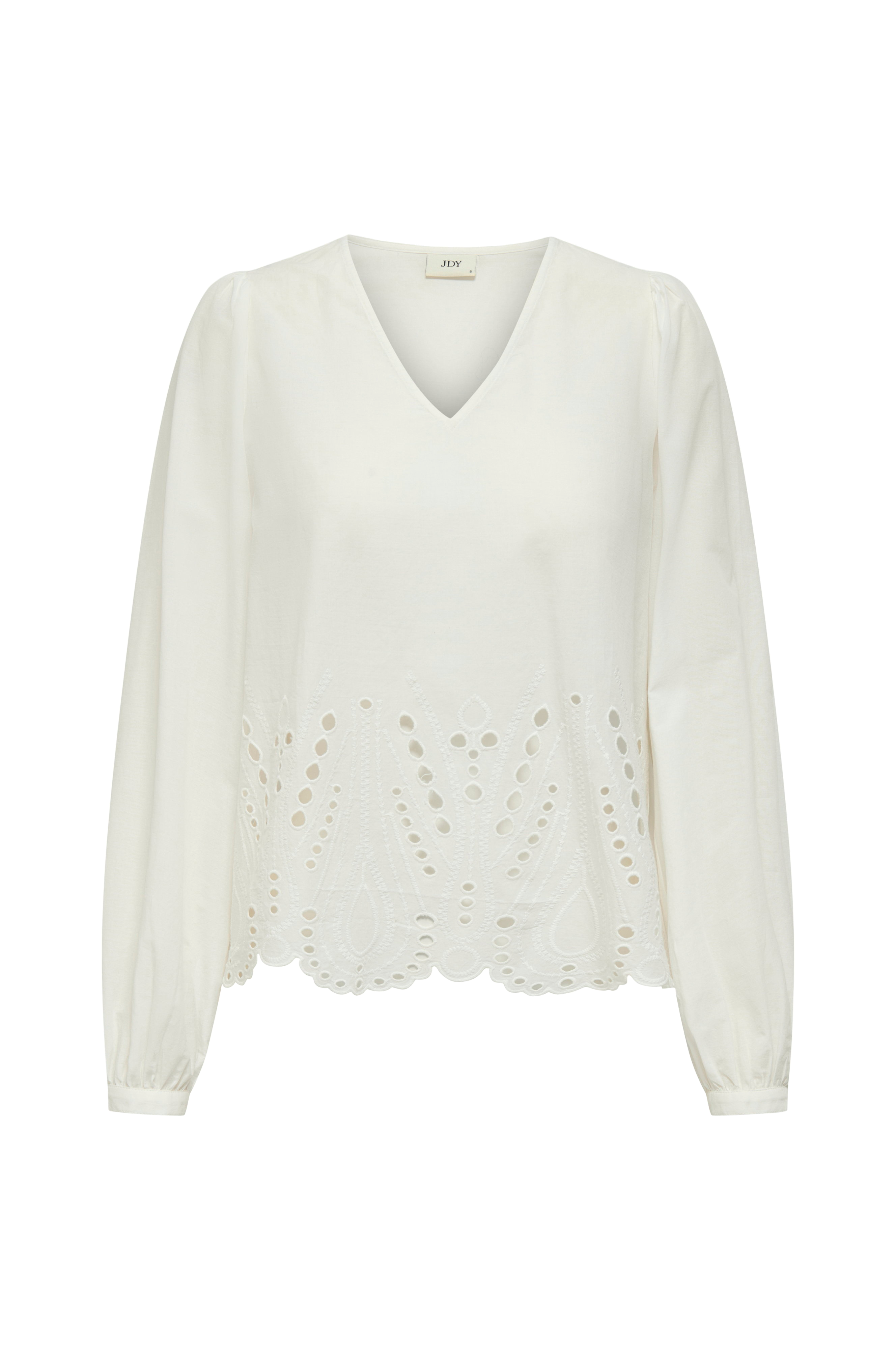 • Bred model med hulbroderier nederst og bølget kant• V-udskæring• Ballonærme med tynd manchet