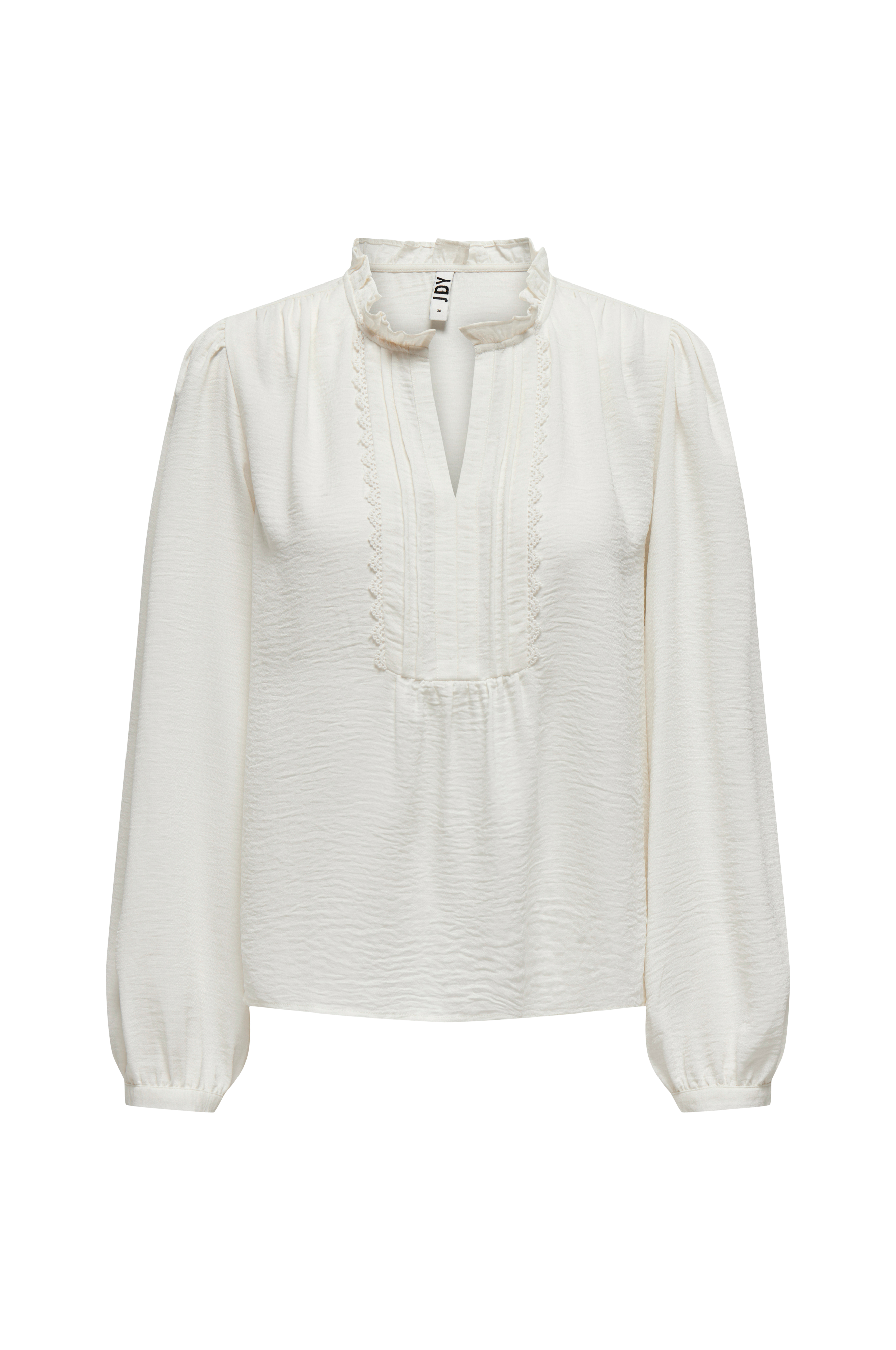 • Tynd, semitransparent bluse i let krøllet materiale• Lange pufærmer med tynde manchetter ved manchetterne• Rund halsudskæring med flæsekant og v-udskæring• Bølgeformede detaljer med blondekant ved udskæringen