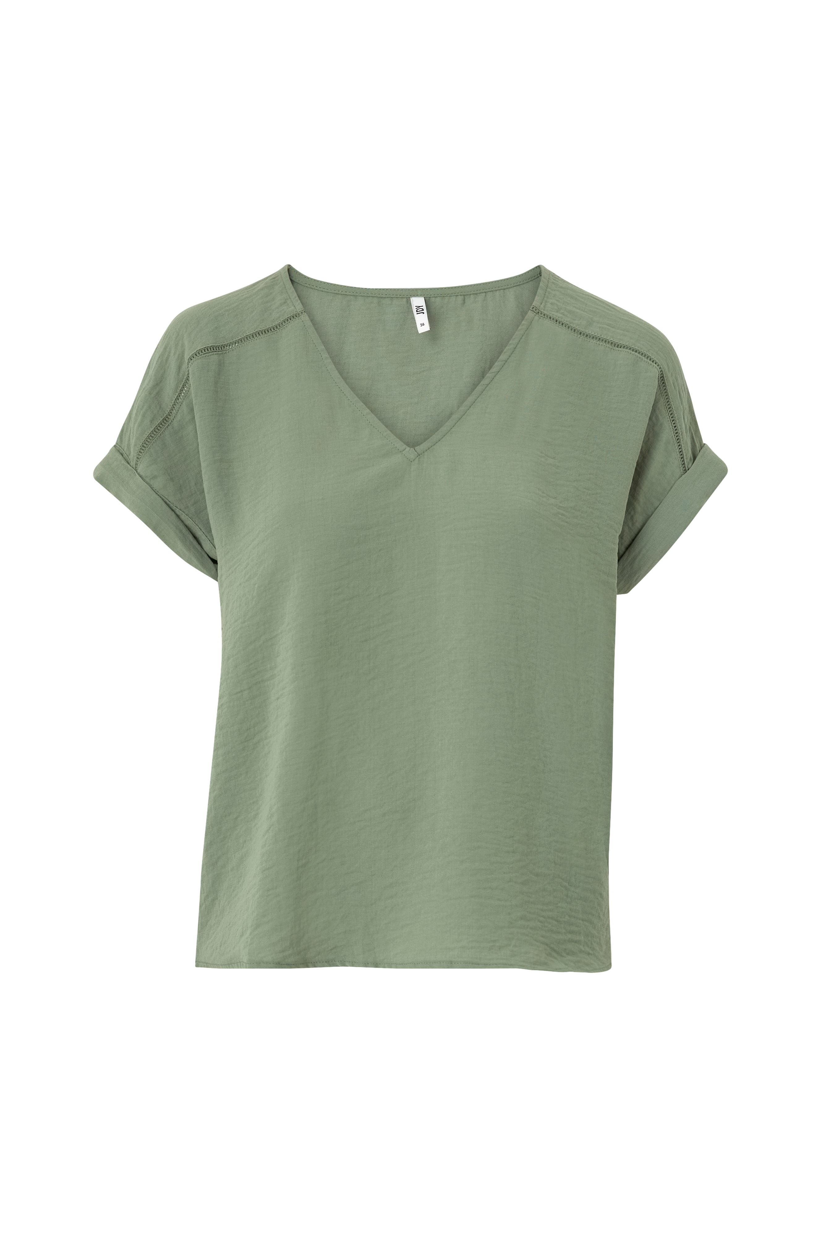 • Korte ærmer med oprullet• V-udskæring• Krøllet struktur